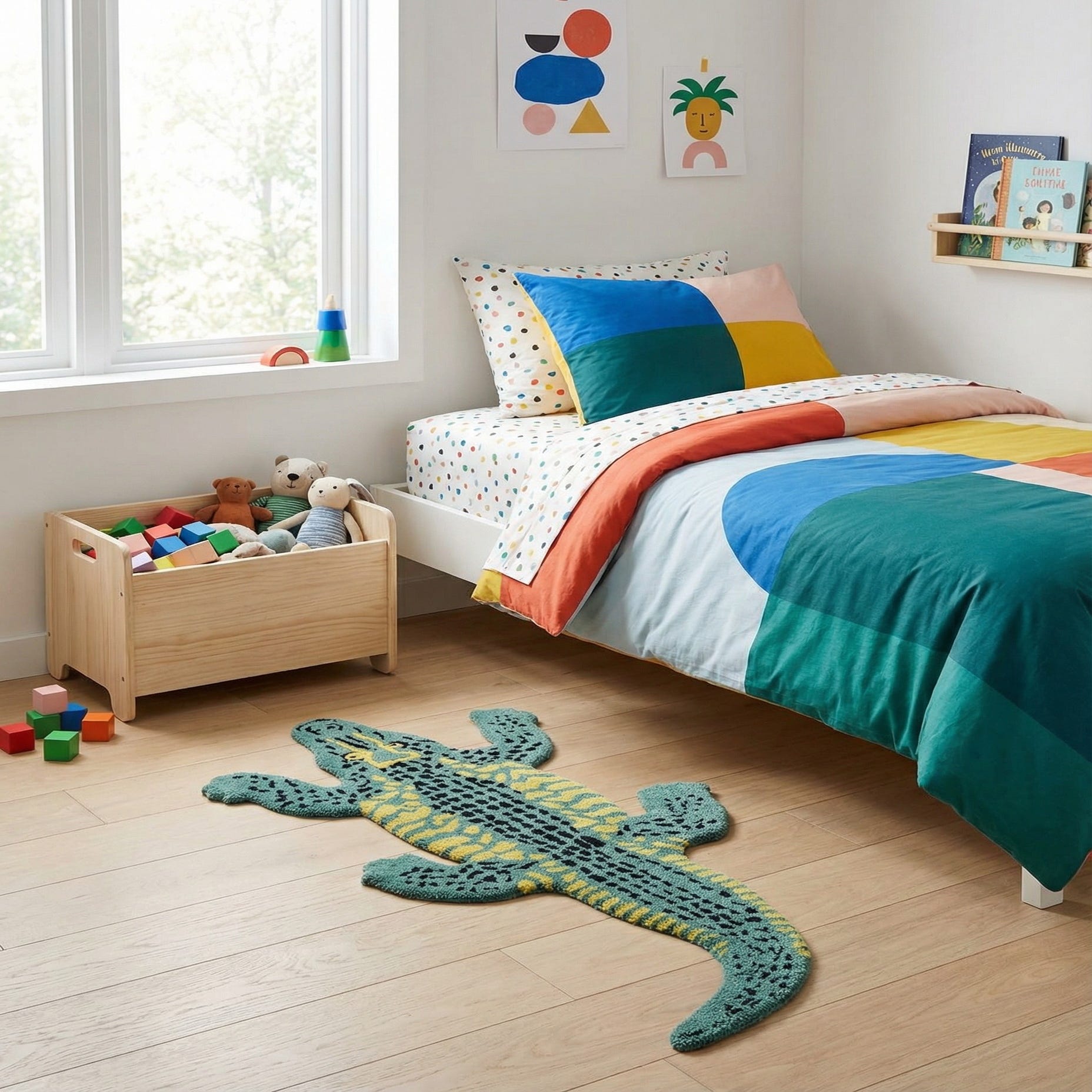 Hand-tufted from 80% wool and 20% cotton, this free-form rug is shaped like a playful crocodile with a green field that defines the body. Black scale-like spots run down the center and across the limbs, while pops of yellow form bold stripes and facial accents that catch the eye. The wool pile feels soft and springy underfoot, and the tufted construction creates a raised, tactile surface so the spots and stripes are both visible and touchable.