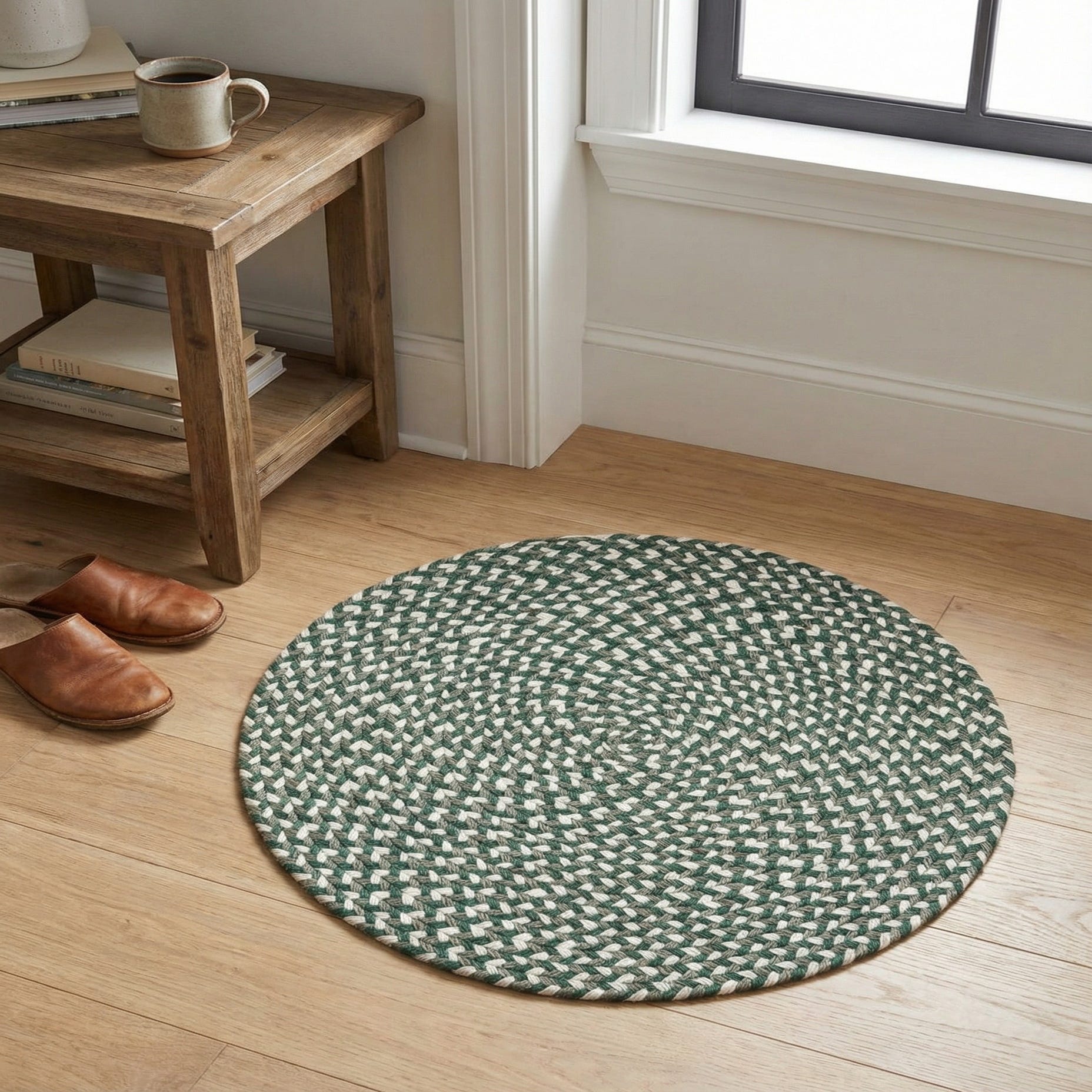 Hand-braided from 100% jute, this round rug features a classic concentric braid with a green background woven together with ivory strands for a soft, tweed-like effect. The spiral pattern creates gentle visual movement while the alternating fibers add depth and texture. The tightly braided construction gives the rug a low-profile, slightly nubby feel that’s pleasant underfoot and shows the natural character of jute fibers.