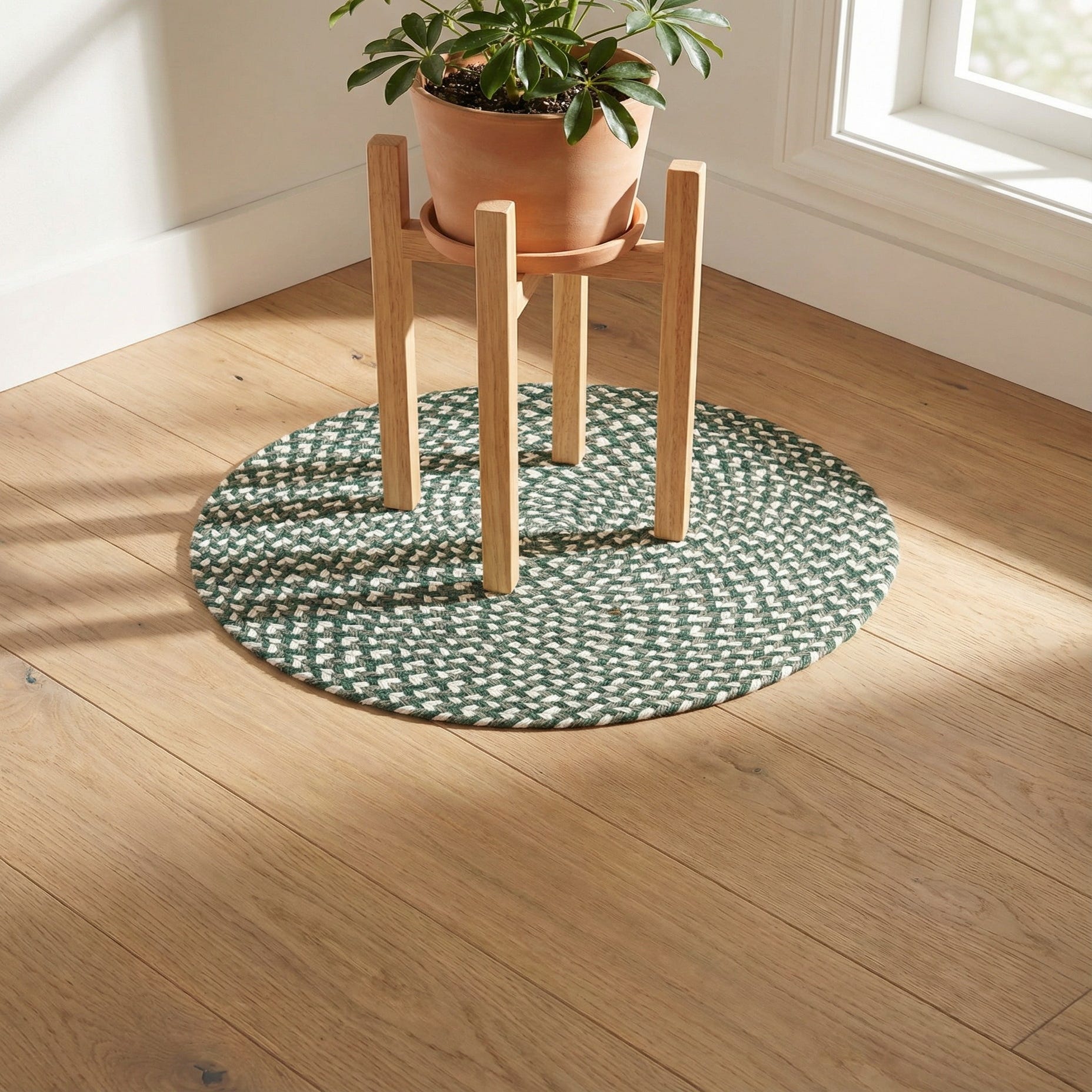 This piece works well in casual, layered interiors — pair it with light wood or rattan furniture and linen upholstery for a relaxed coastal or farmhouse look, or use it in a boho or cottage-style reading nook beneath an accent chair. It’s also a good choice for anchoring a small cafe table in a breakfast corner or adding texture to a sunroom or mudroom where natural materials complement the space.