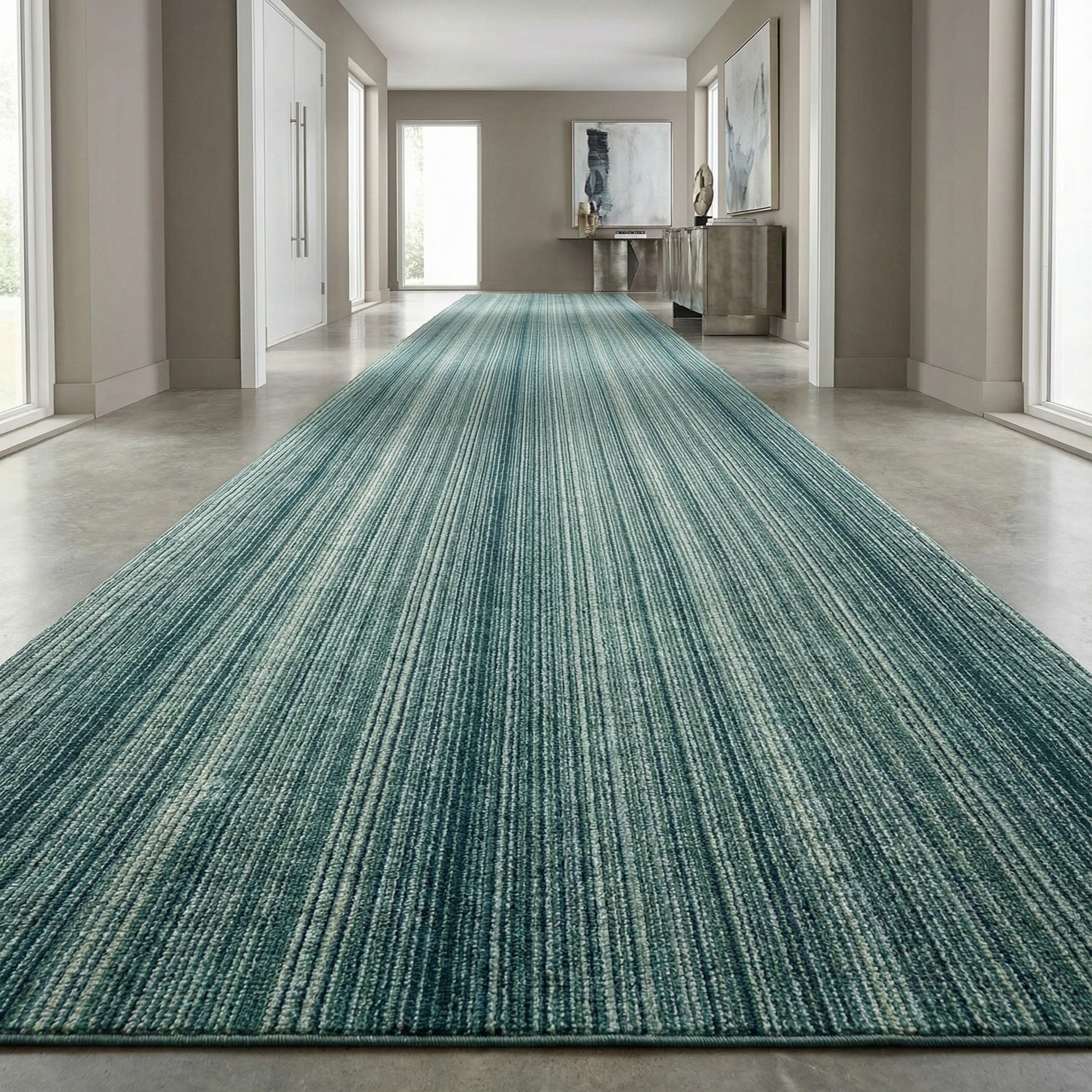 A narrow, linear stripe pattern runs the length of this runner, creating a calm sense of movement through fine, closely spaced striations. The background is Green, accented by bands of Light Green and Olive that layer subtly for tonal depth. Machine-made in polypropylene, the construction produces a low-profile, dense pile with a soft hand and a faint, even sheen that catches light without overpowering a room.