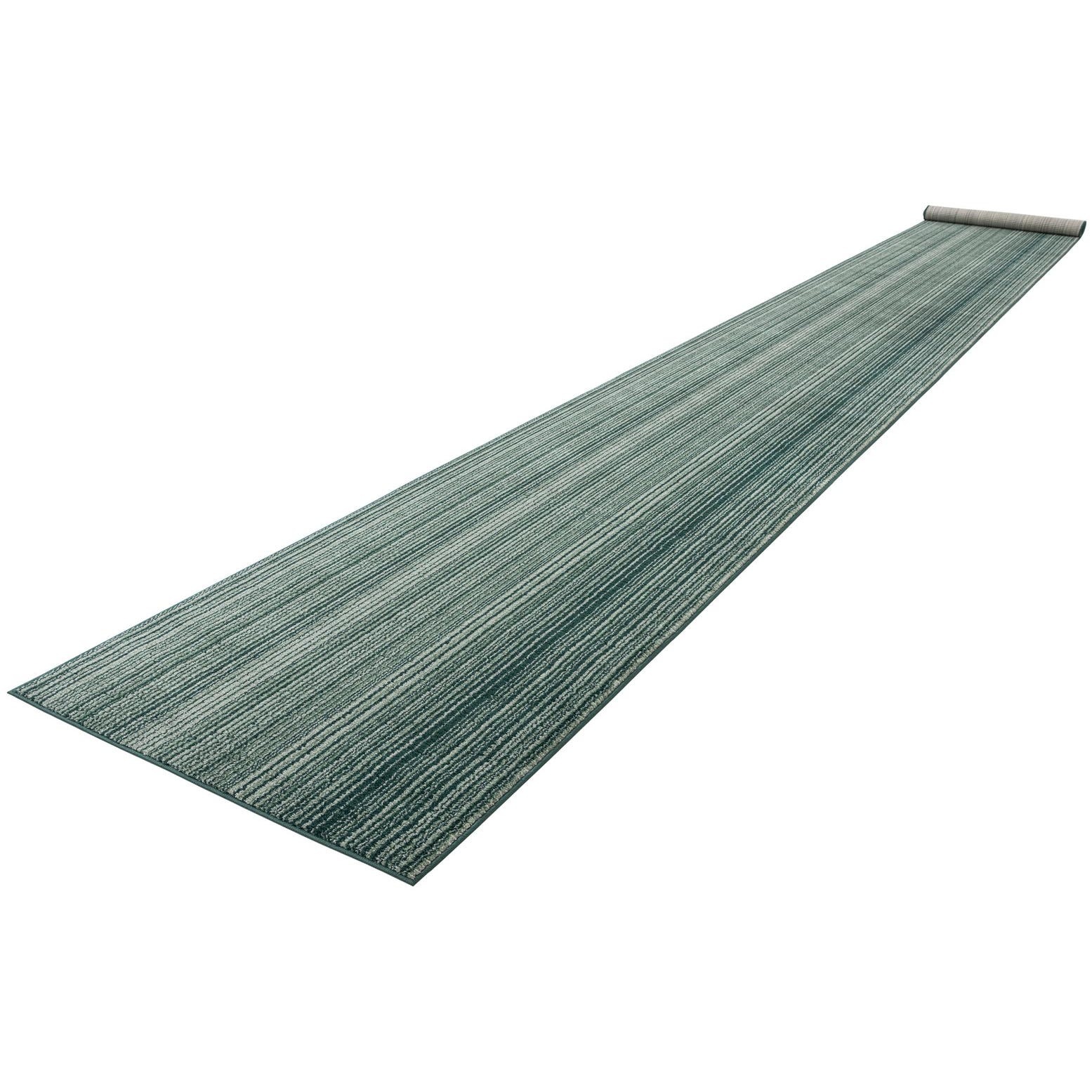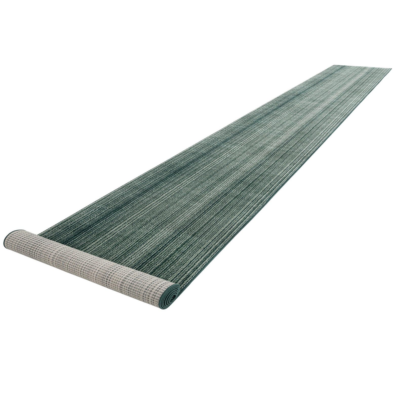 A 26 ft runner rug from the Rugs.com Gemstone collection, featuring varying shades of green stripes and a textured, high pile.