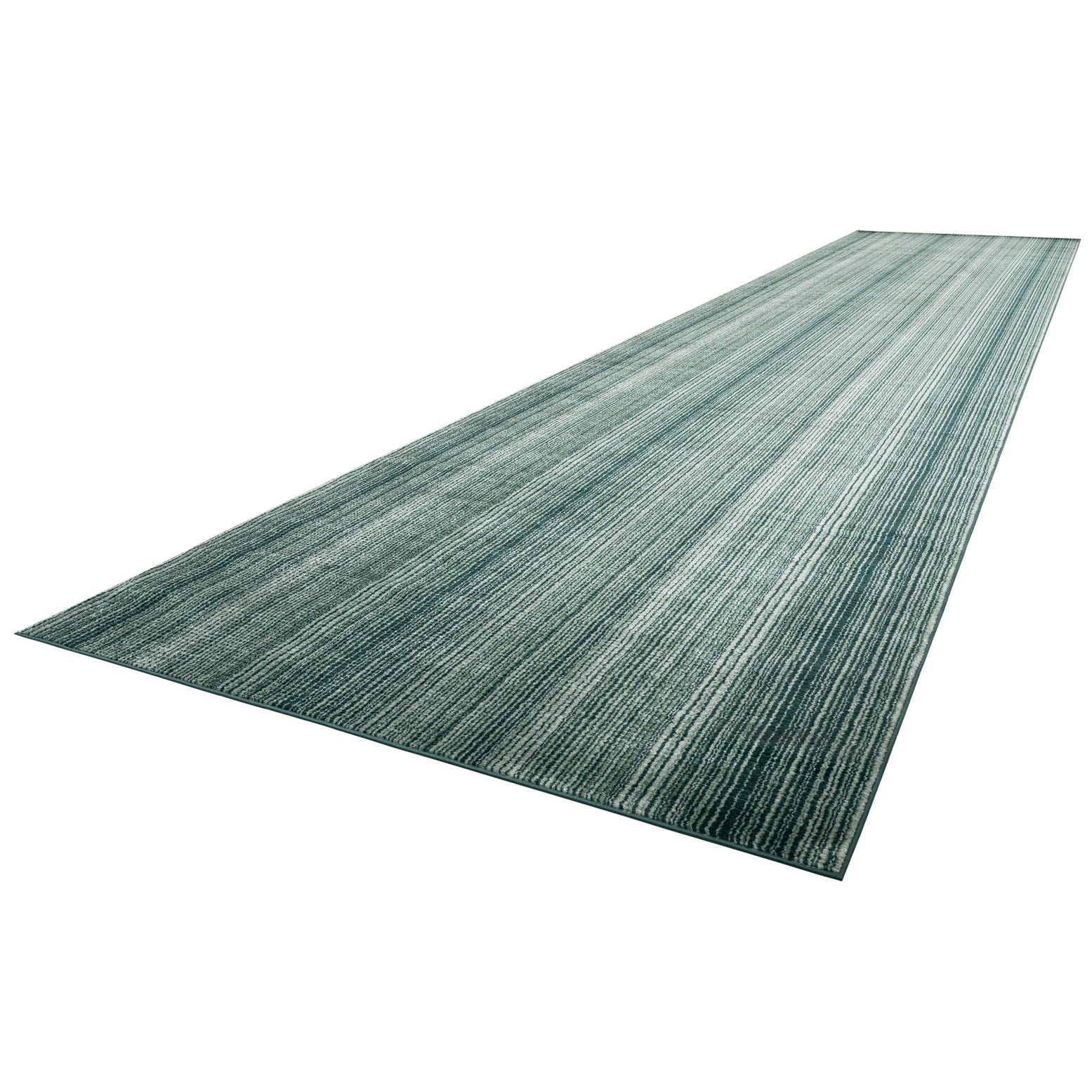 A 26 ft runner rug from the Gemstone collection, featuring vertical stripes in varying shades of green, ideal for a long hallway or patio.