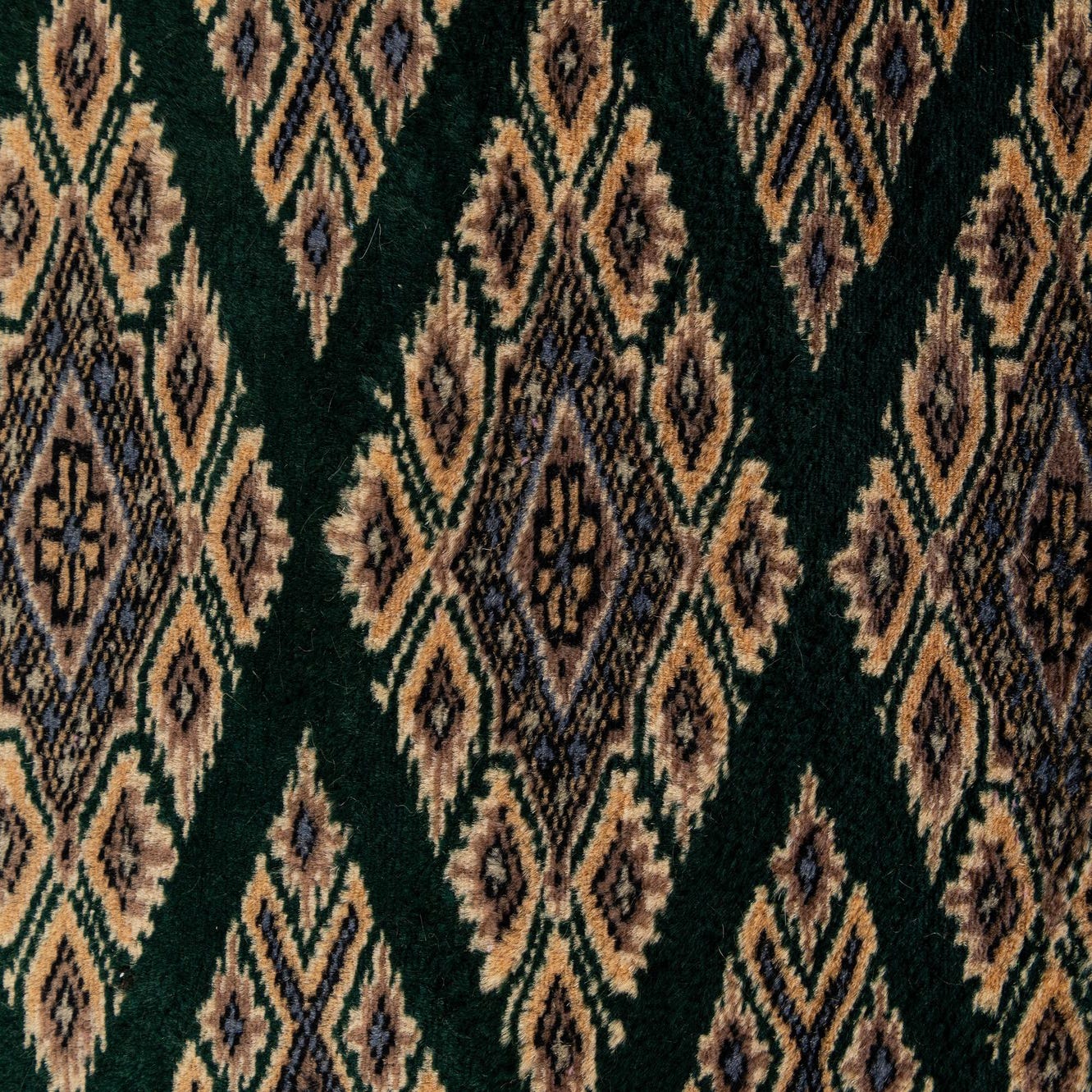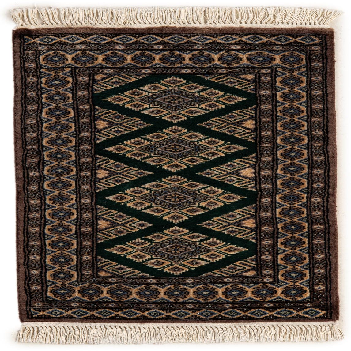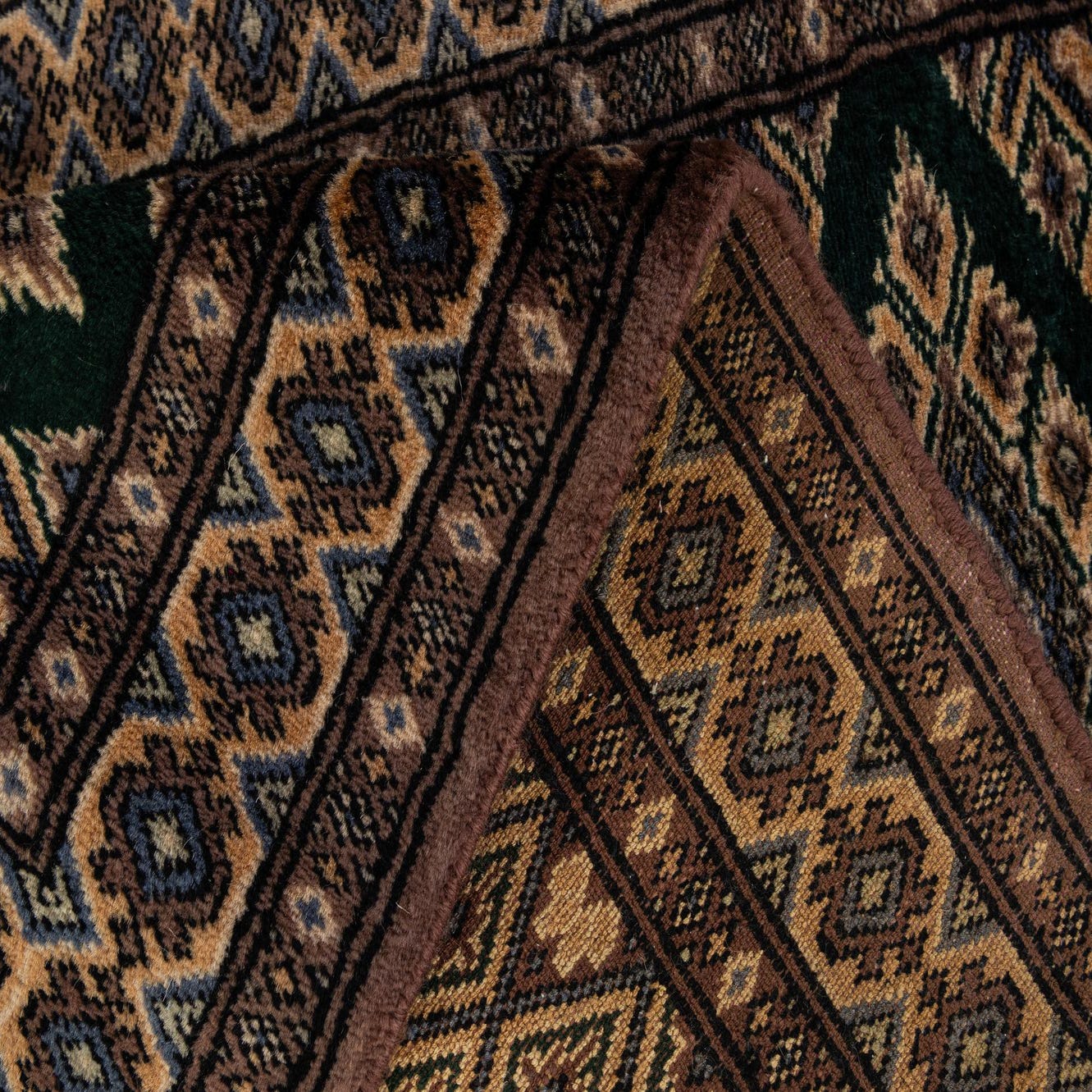 A 2x3 rectangular Bokhara rug with a deep green field, intricate diamond patterns in gold and blue, and a brown border, featuring white fringe.