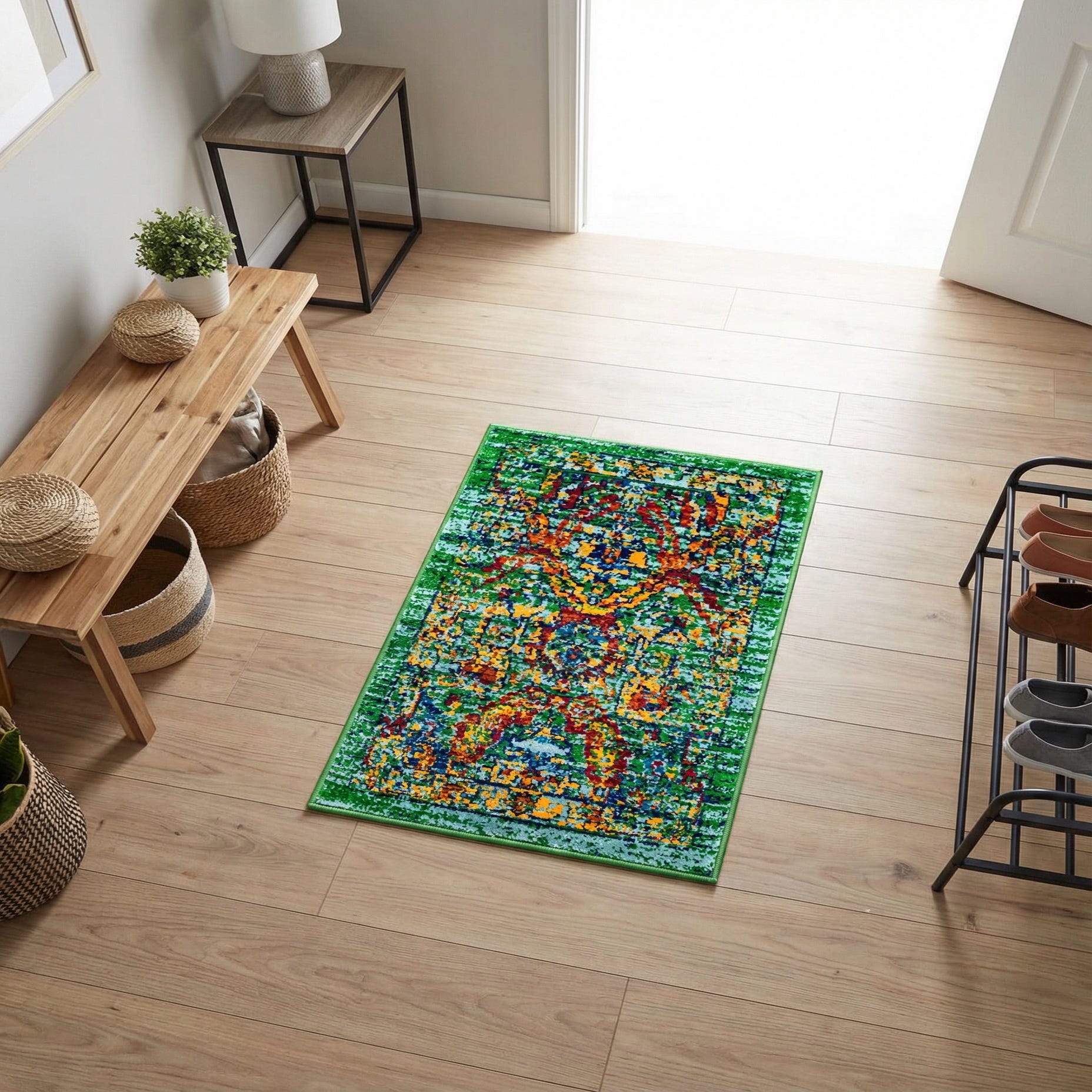 A vibrant medallion pattern is reimagined in a painterly, distressed finish that balances traditional motifs with a modern, graphic energy. The ground is a fresh green, while layered accents of light blue, navy blue, red and orange create a lively, mosaic-like surface. The design reads as both ornate and abstract, with the colors working together to create depth and movement across the face of the rug.