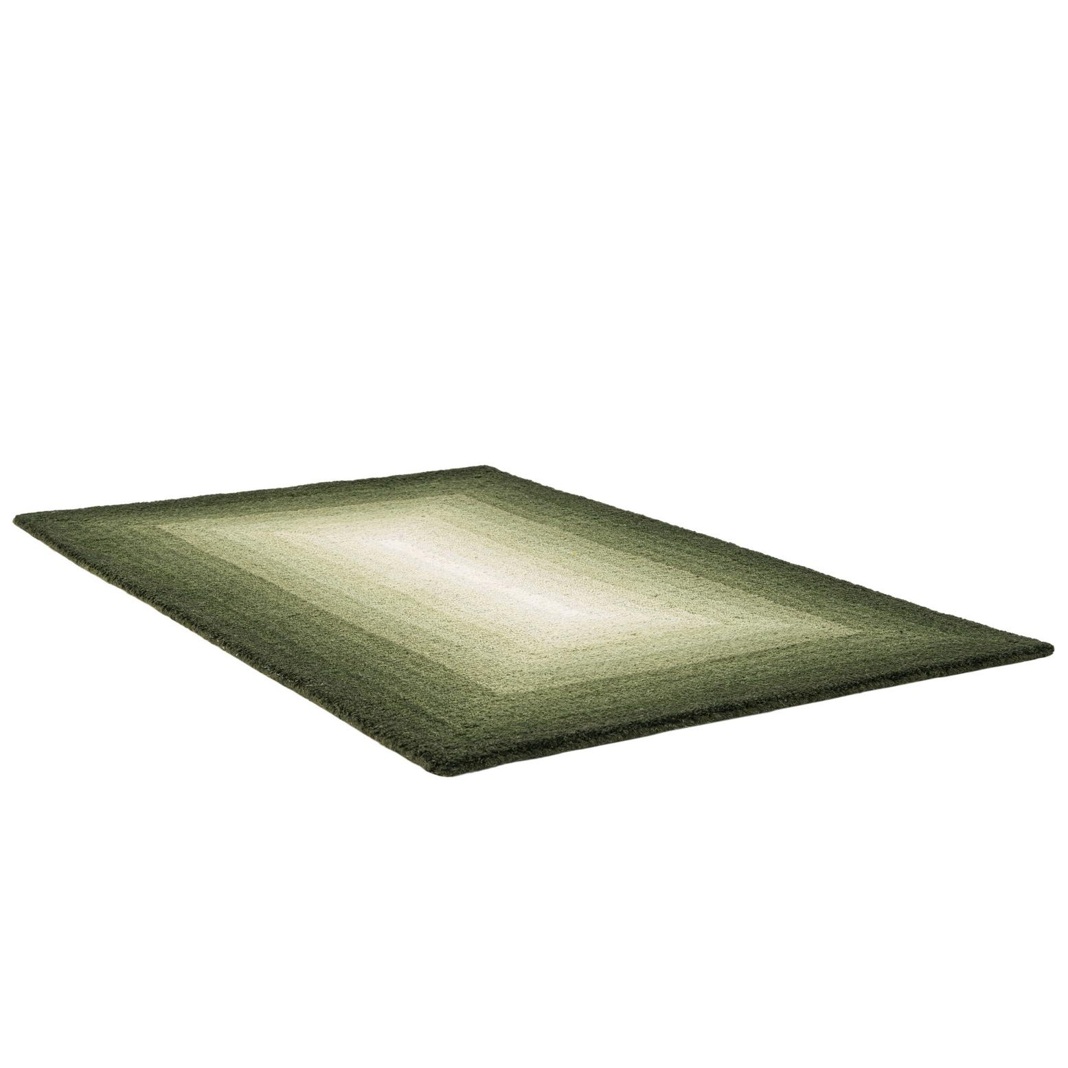 A rectangular 2x3 green wool rug with an ombre design, transitioning from dark green edges to a light green center.