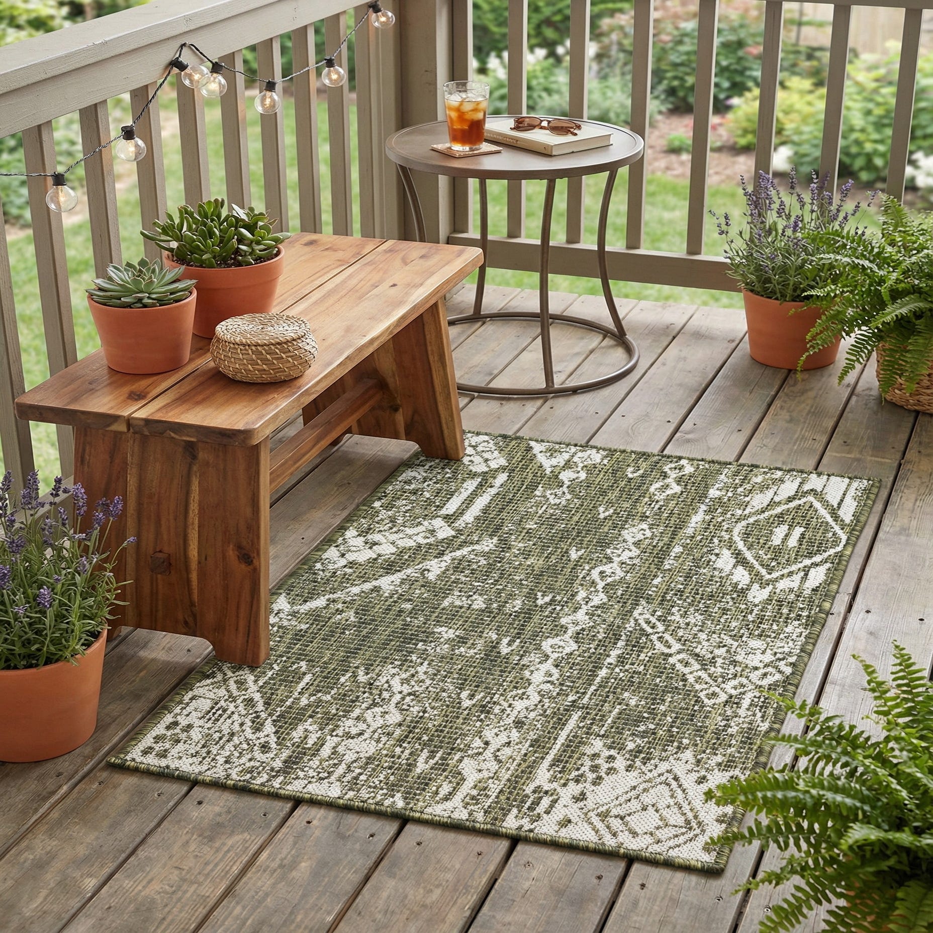 A 2x3 rectangular Rugs.com Outdoor Bohemian rug featuring a modern green and white geometric pattern with a textured flatweave.