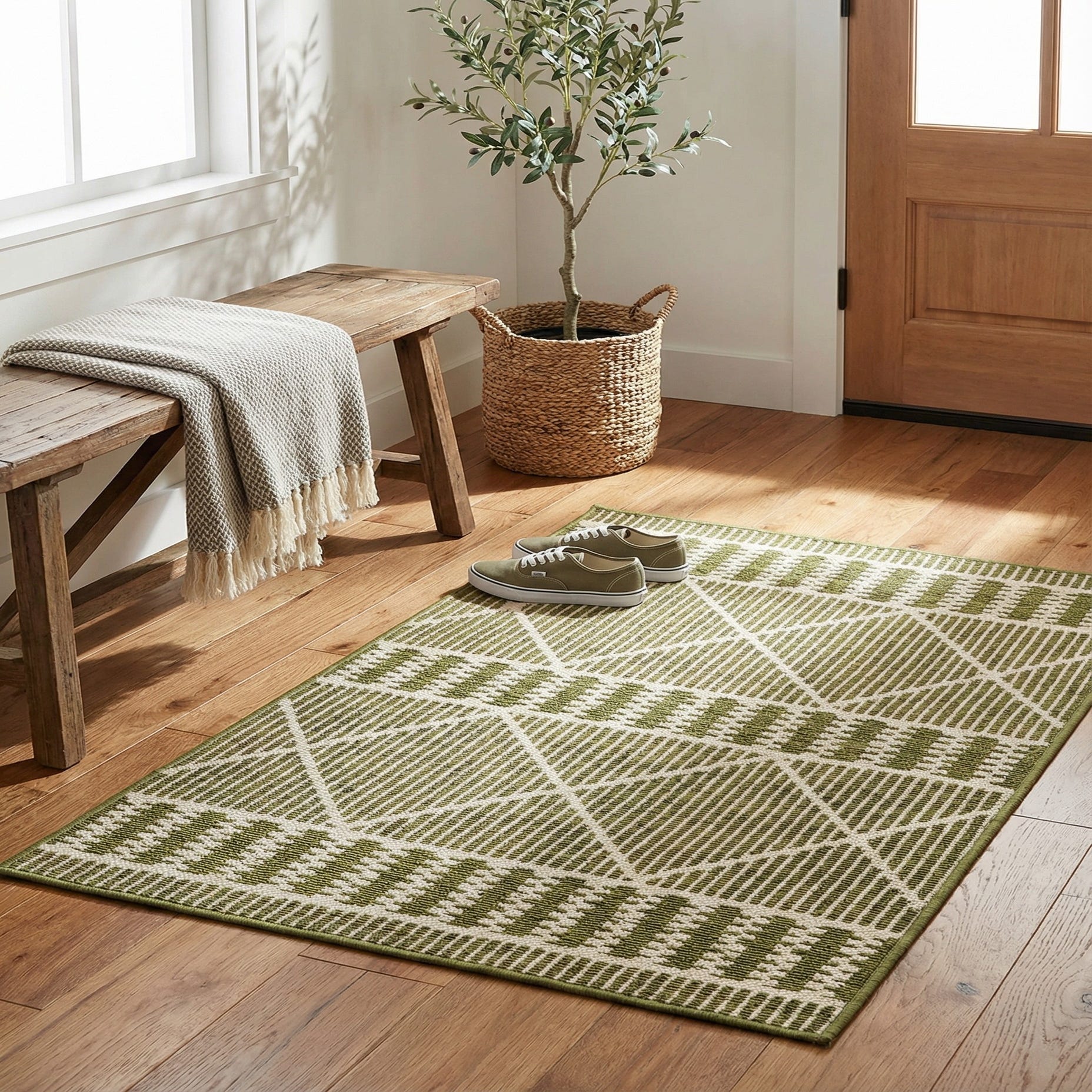 This design works well on a covered patio or screened porch where the green background complements potted plants and natural wood tones, and it also functions nicely in a breezy sunroom, entryway, or by a bistro set on a balcony. Pair it with rattan or teak furniture, cream cushions and brass or matte-black accents for a contemporary outdoor look, or use it indoors to add pattern and color to a casual dining area or mudroom.