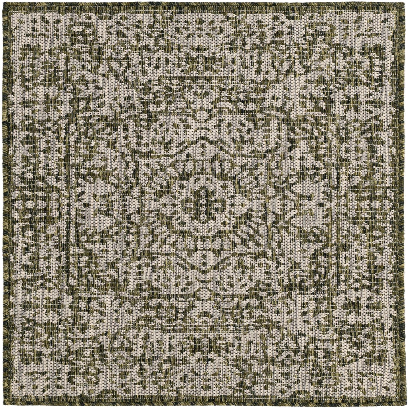 A 2x3 rectangular green and off-white flatweave rug with a distressed traditional pattern, suitable for indoor/outdoor use.