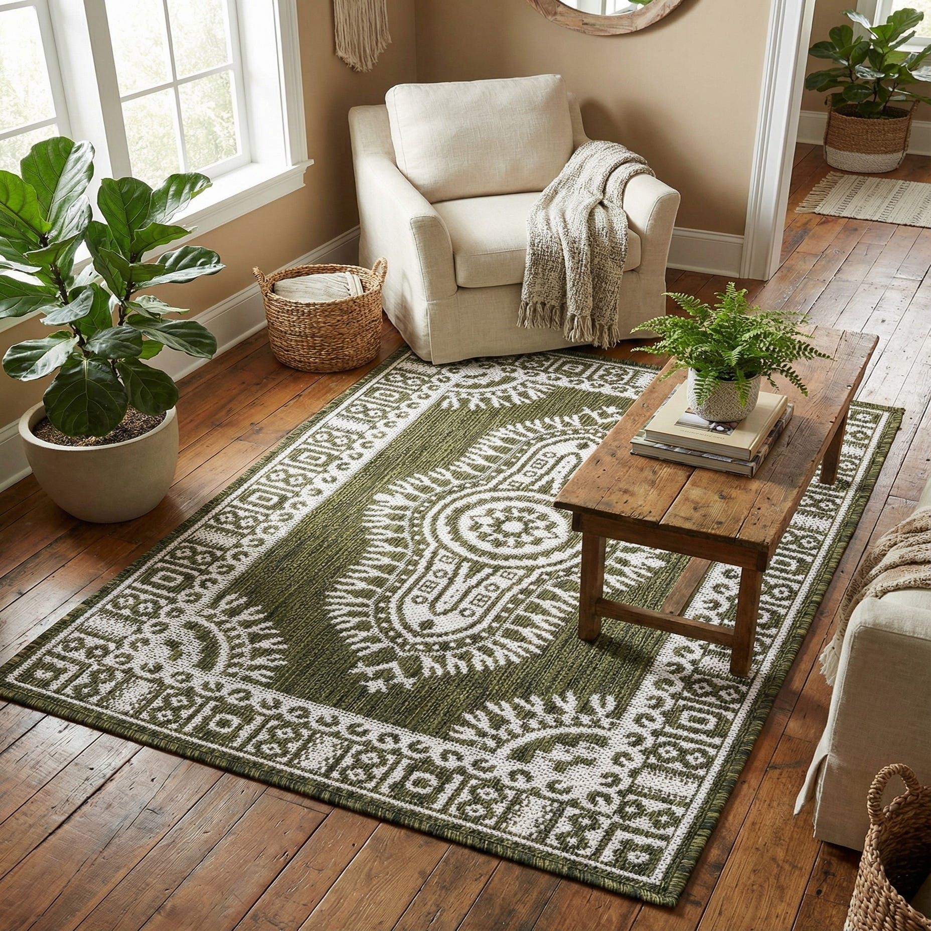 This rug works well in covered outdoor spaces, sunrooms, or high-traffic interior spots like an entryway or kitchen nook; it can also anchor a small seating area or sit beneath a bistro set. Pair it with natural woods, rattan or wicker furnishings and neutral linens for a relaxed, earthy vibe, or combine it with brass accents and deep green houseplants for a more tailored, classic look.