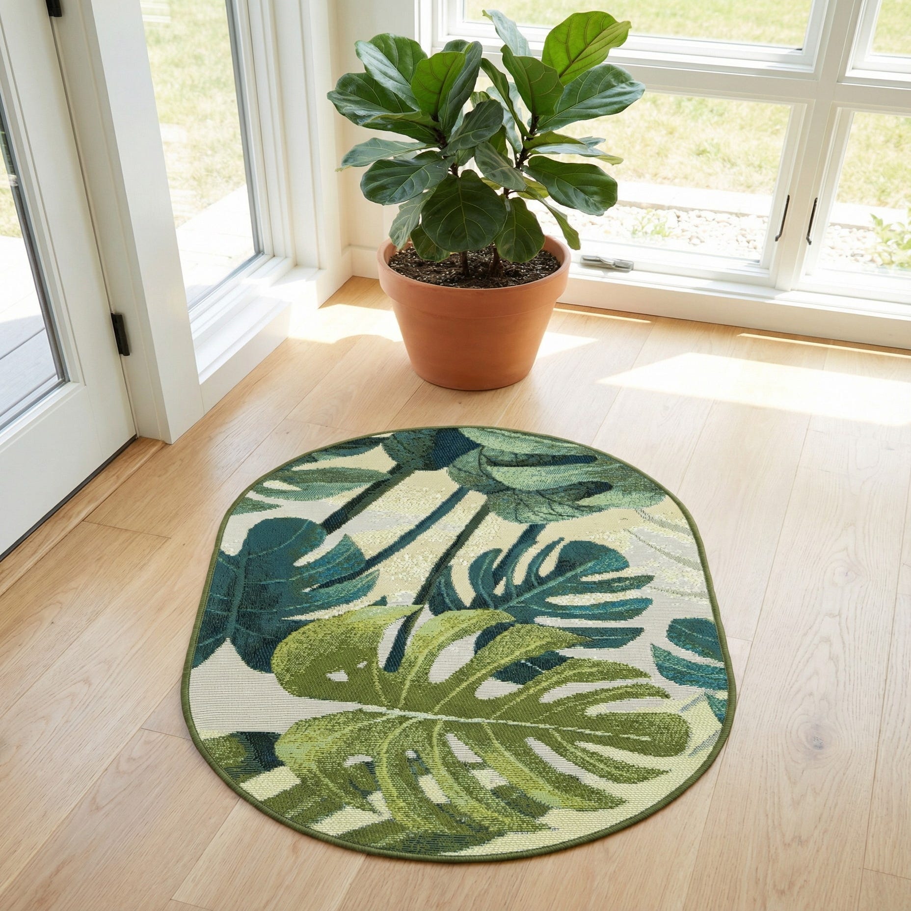 A lush botanical motif takes center stage on this oval rug, where oversized Monstera- and palm-like leaves overlap across a green background. The palette layers green, light green, olive, and ivory to create depth and contrast, with the lighter tones picking out leaf veins and edges. Machine-made from 75% polypropylene and 25% polyester, the surface has a low-profile, tightly woven texture with subtle ribbing and slightly raised patterning where the weave defines each leaf.