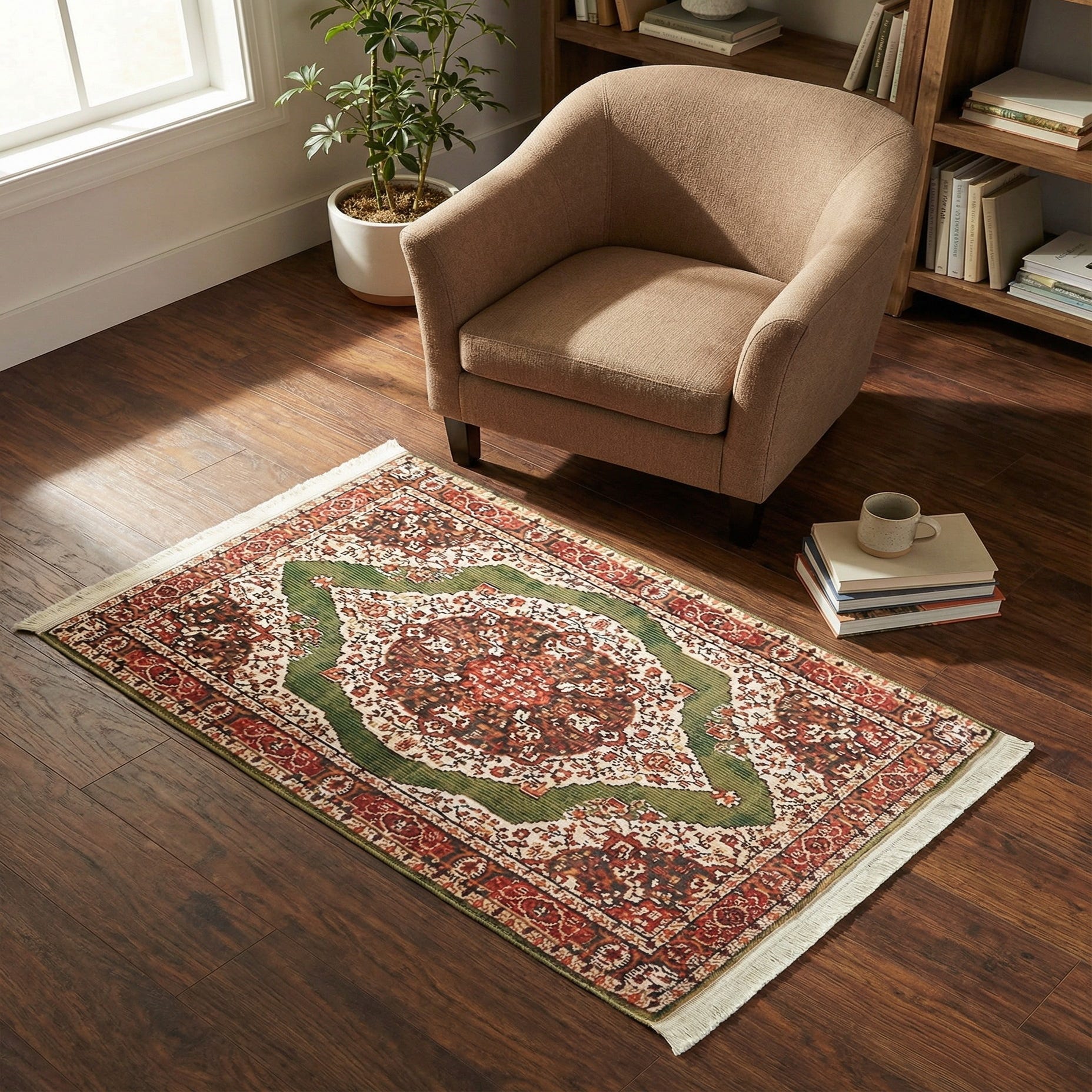 A classic Persian medallion motif rests at the center of a rich green field, bordered by a detailed floral band in warm reds and oranges. Intricate ivory arabesques and olive accents form a layered, symmetrical pattern around the central medallion, while small touches of blue and yellow add subtle contrast across the design. Machine made of 100% polypropylene, the rug has a low, tightly woven pile with a smooth, slightly lustrous finish that lies flat underfoot and carries the pattern with clear definition; the short ivory fringe at each end completes the traditional look.