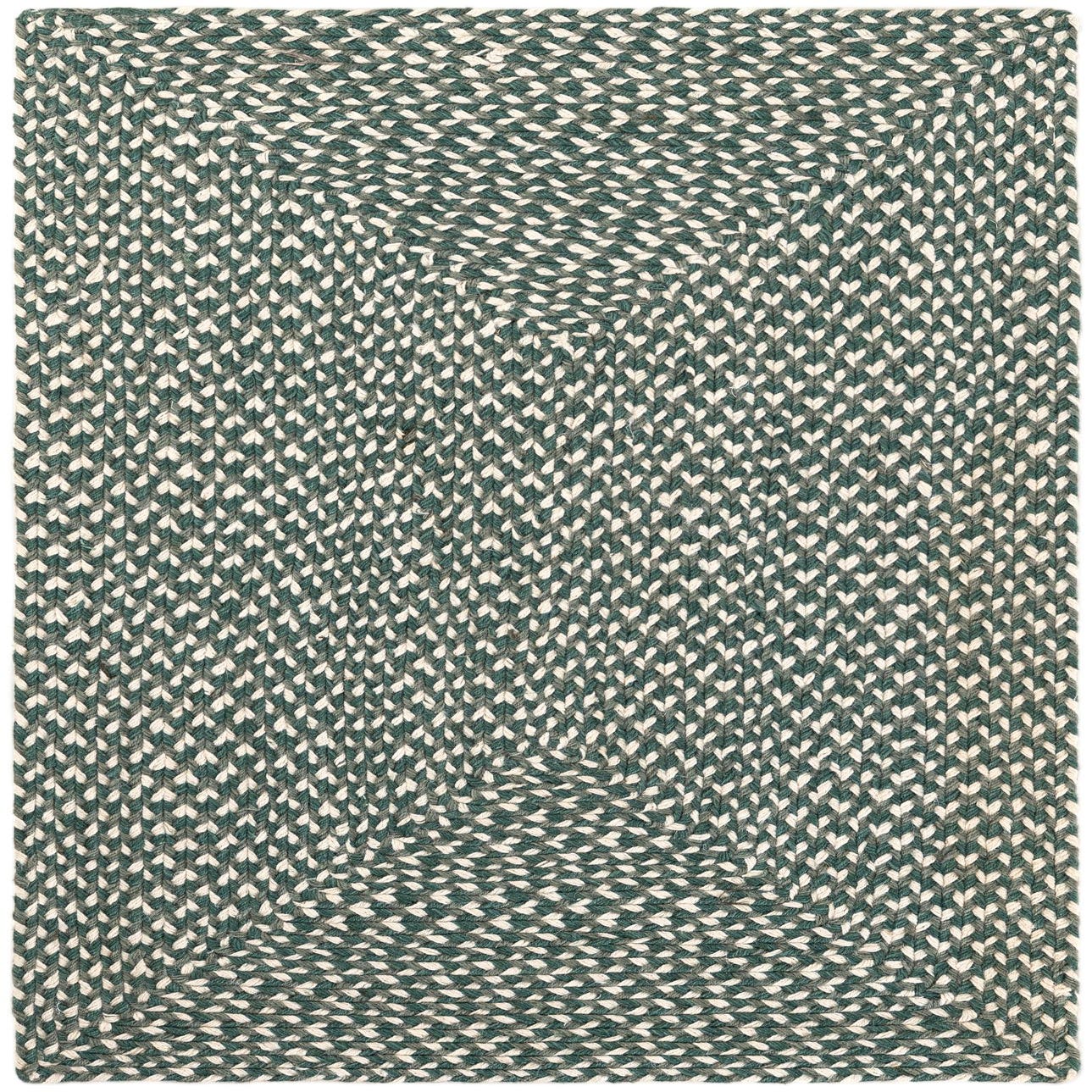 Hand-braided from 100% jute, this rug showcases a tightly woven braided pattern in alternating strands of green, light green, and ivory set against a green background. The braids form concentric rectangular rows that create a subtle tweed effect, while the natural jute fibers give the surface a firm, rope-like texture with clear, dimensional stitch detail. The combination of green tones with ivory highlights delivers a grounded, organic look that remains visually interesting without overpowering a room.