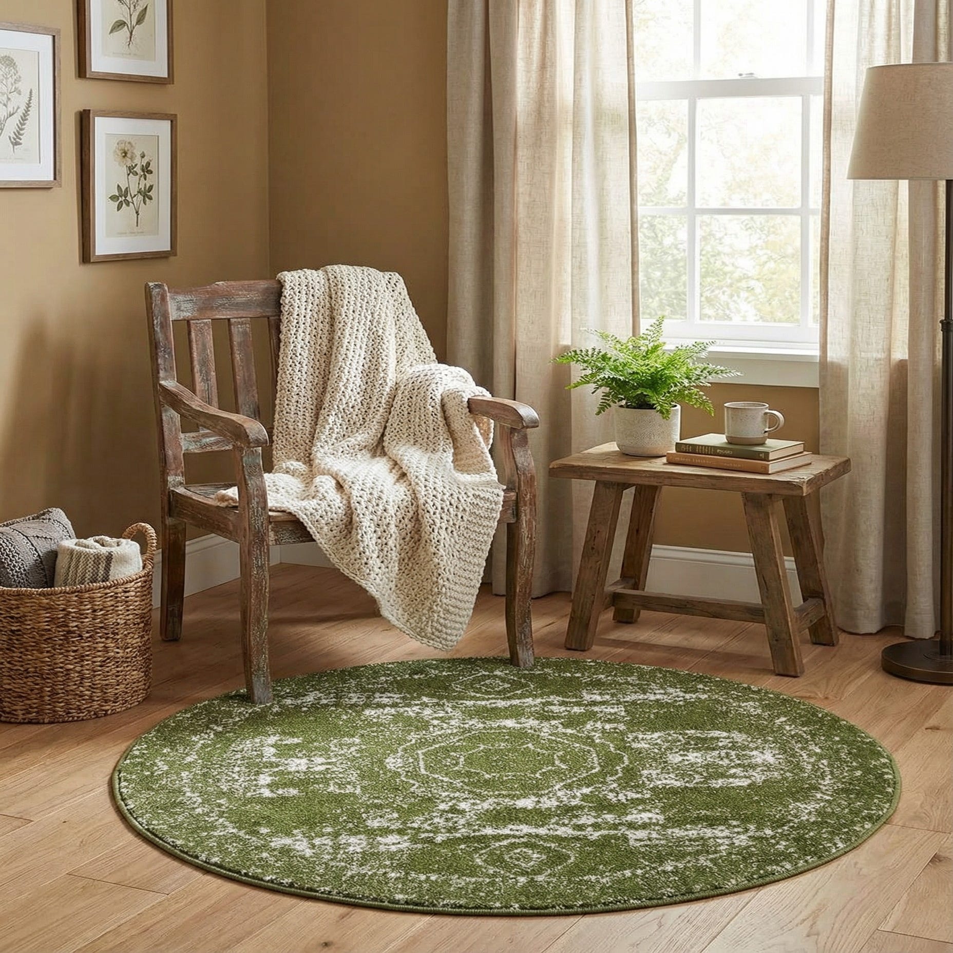 A 3' 0 x 3' 0 round green Bohemian rug with a distressed white medallion pattern, suitable for indoor use.