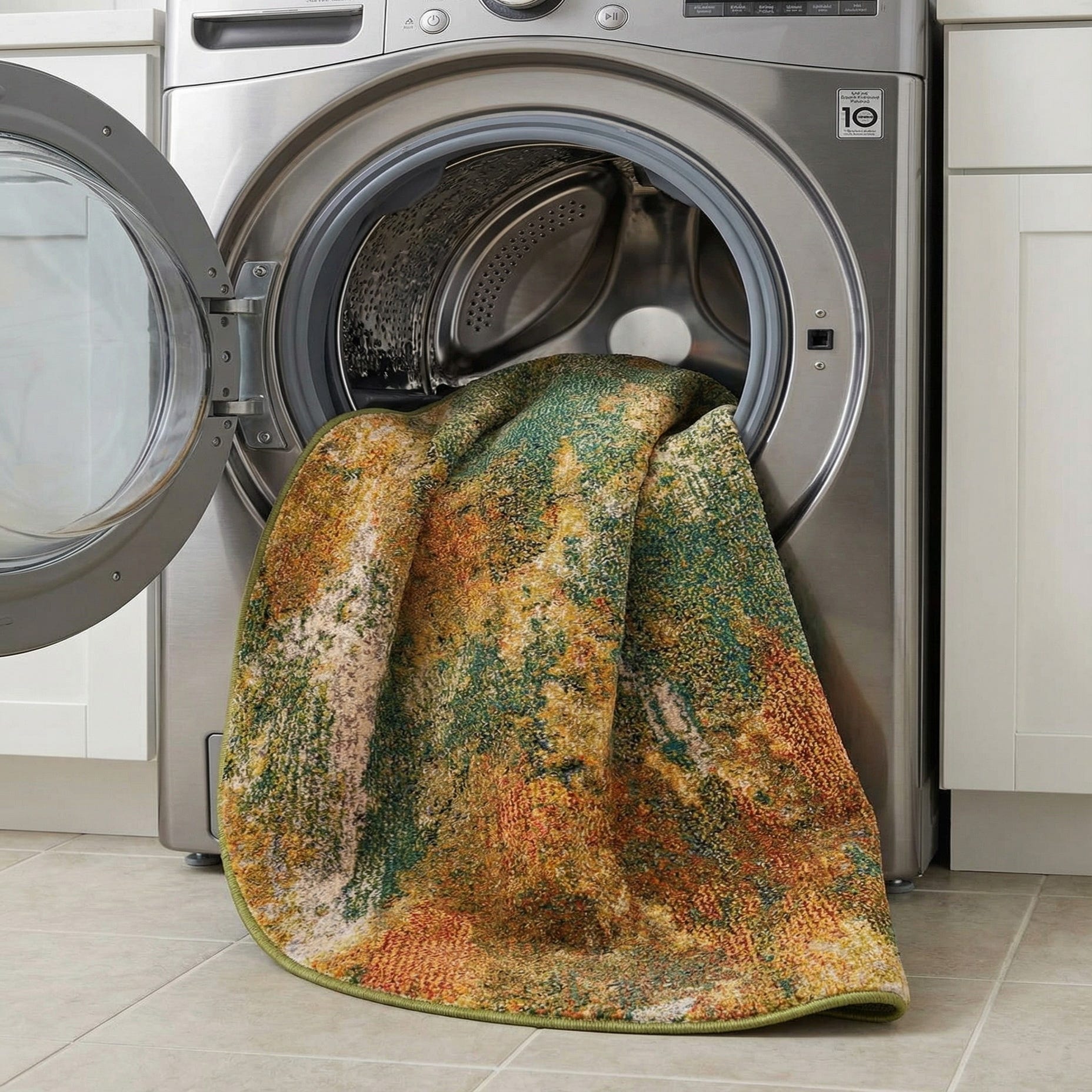 This piece works well anywhere you want a pop of color without a busy repeat—try it under a small round dining table, in a reading nook, or positioned in an entry to welcome guests. It pairs naturally with mid-century and contemporary furnishings, warm wood tones, rattan or woven accents, and neutral upholstery for balance. The organic, painterly look complements eclectic and bohemian schemes as well as more pared-back modern interiors.
