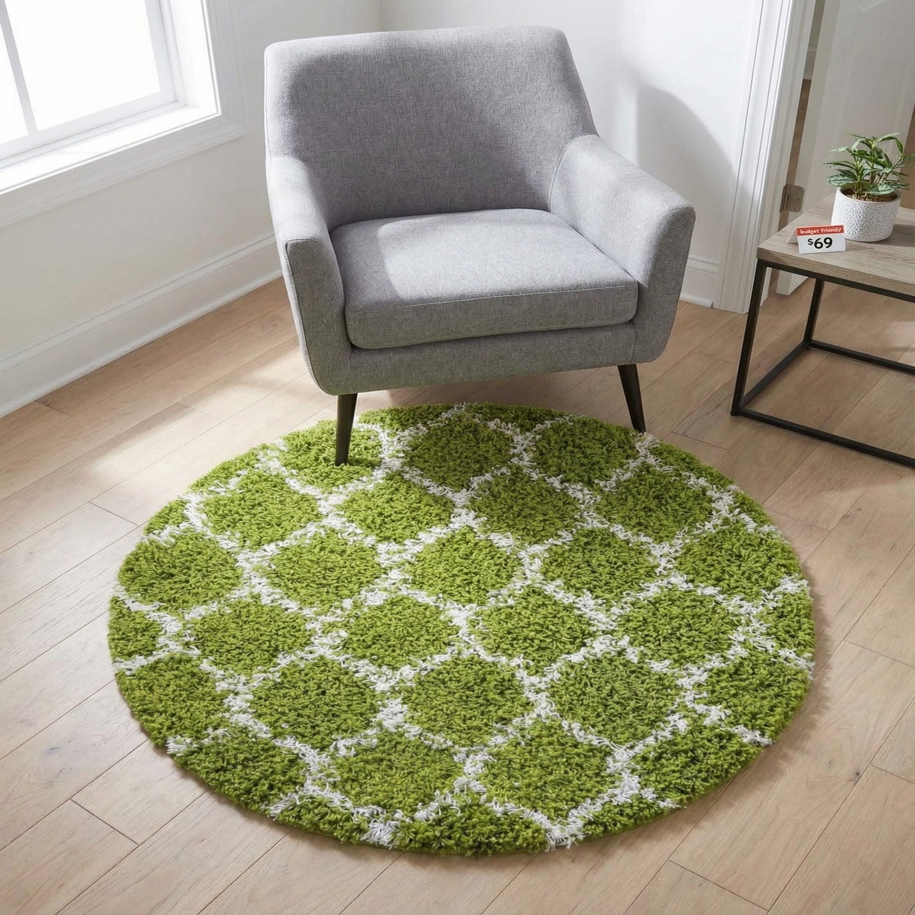 A round shag rug with a lively green background and an ivory lattice trellis pattern that creates a repeating diamond motif. The dense, high-pile shag feels plush underfoot, the long polypropylene fibers offering a soft, cushioned texture and visible depth where the ivory lines intersect the green field. Machine-made from 100% polypropylene, this piece presents a clean, modern pattern with a tactile, comfortable surface.