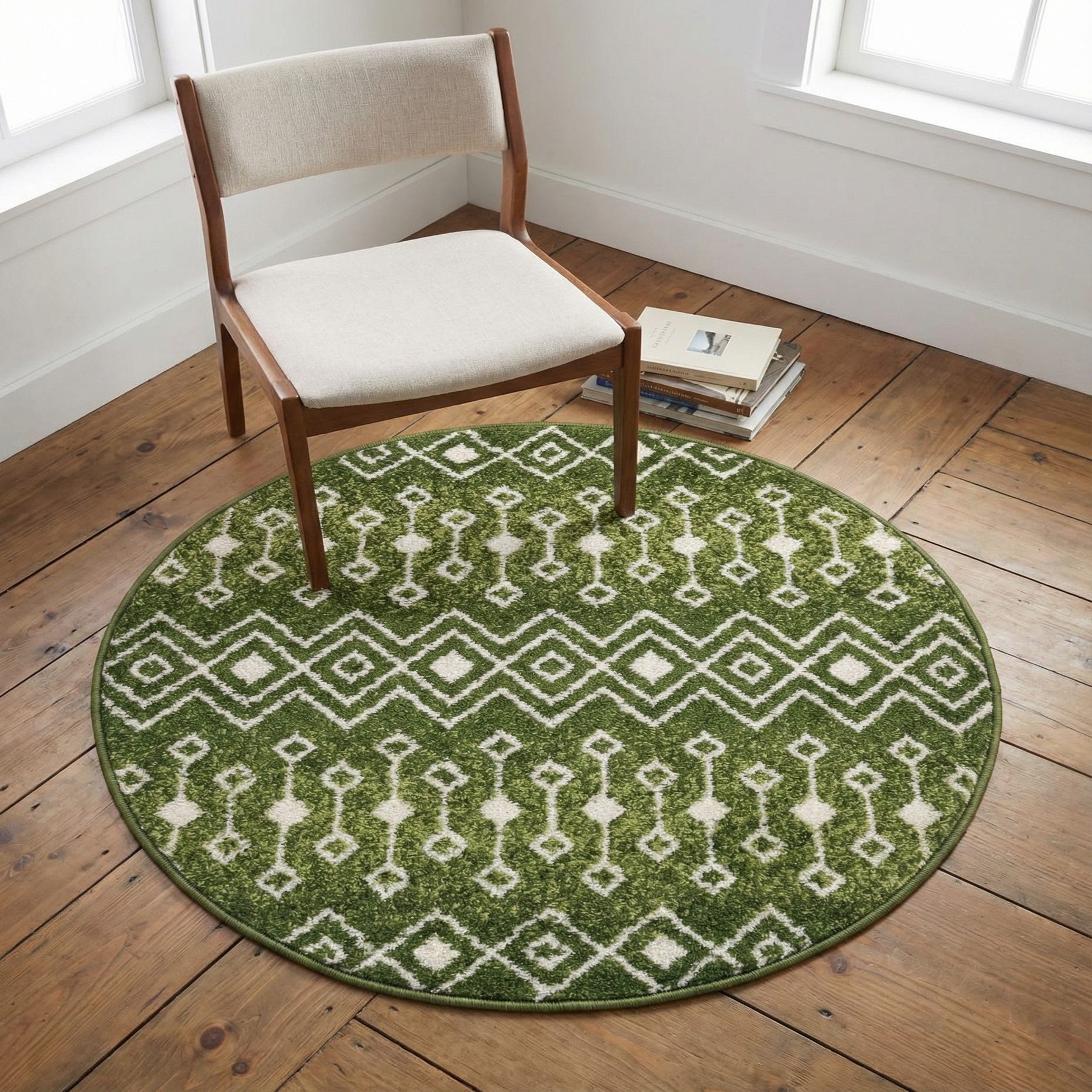 A round rug with a Moroccan-inspired trellis motif, this piece pairs ivory geometric diamonds and vertical lozenge shapes with a rich green ground for a balanced, patterned look. The repeating design creates visual movement while keeping a clean, ordered feel. Machine-made polypropylene construction produces a low, slightly cushioned pile with a soft hand and well-defined pattern contrast where the ivory motifs meet the green background.