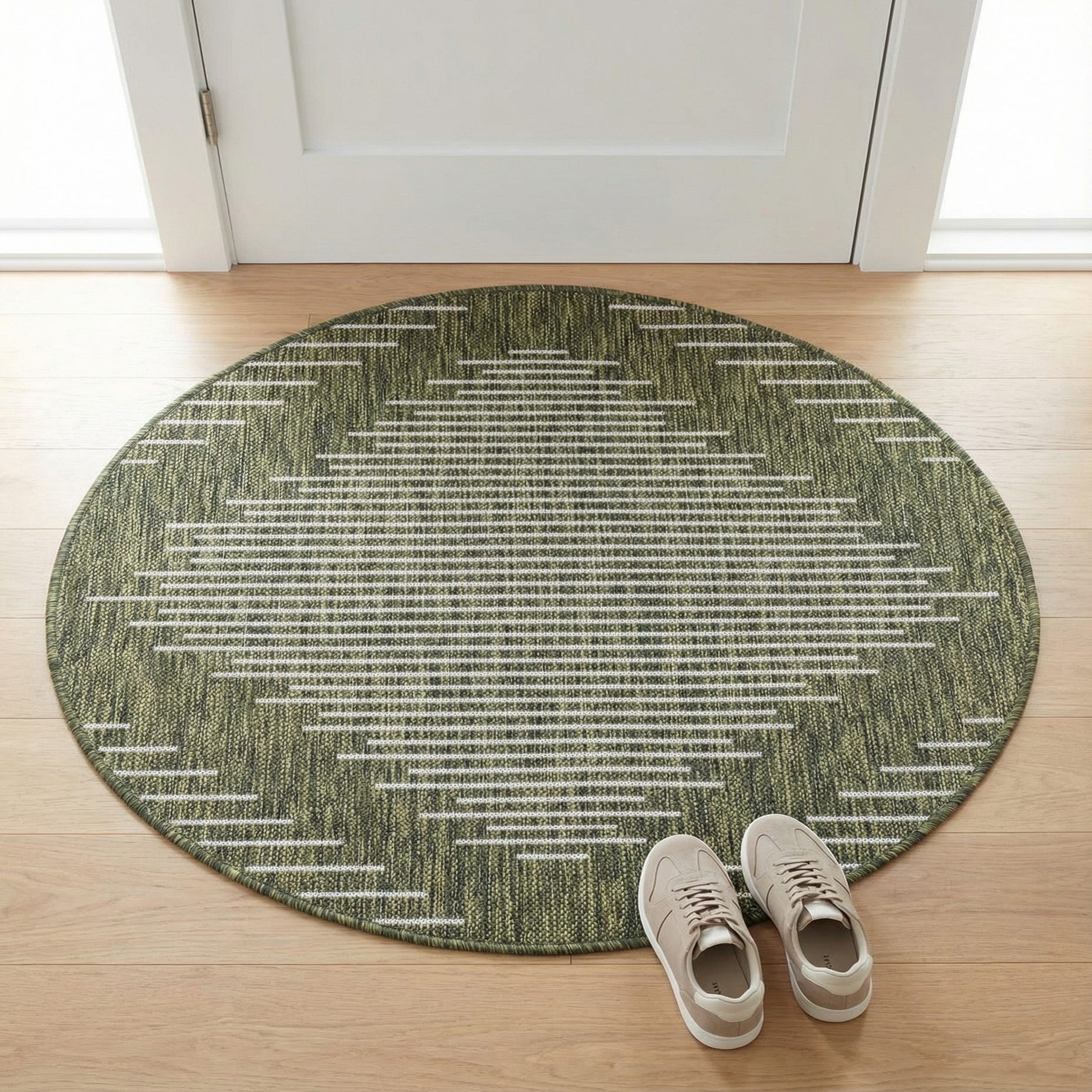 From the Outdoor Modern collection, this 3 Ft Round rug is a durable addition to any space. Machine-woven of 100% polypropylene, the flatweave construction offers a sleek profile and a texture that is pleasing underfoot. The rug features a dynamic pattern of ivory dashes on a green background, presenting a striking contrast and a contemporary vibe.
