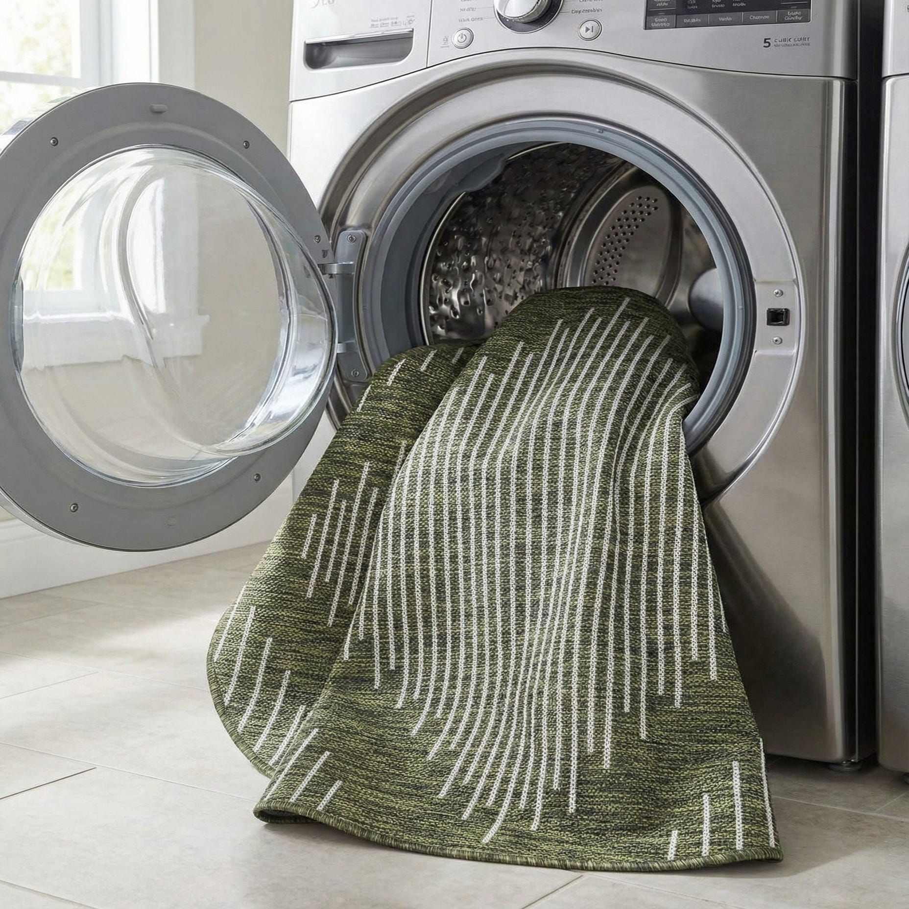 From the Outdoor Modern collection, this 3 Ft Round rug is a durable addition to any space. Machine-woven of 100% polypropylene, the flatweave construction offers a sleek profile and a texture that is pleasing underfoot. The rug features a dynamic pattern of ivory dashes on a green background, presenting a striking contrast and a contemporary vibe.