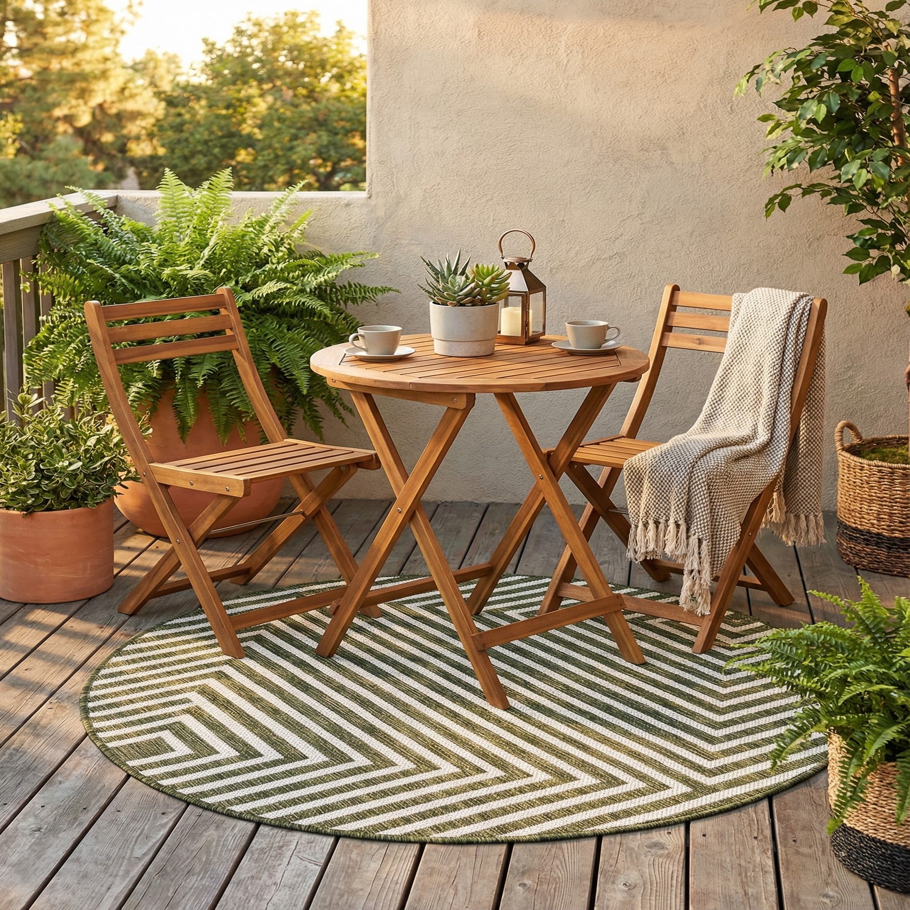 This rug works well on an entry porch, under a small bistro set, or centered beneath a compact seating vignette on a patio or sunroom. Pair it with natural wood or black metal furniture and neutral cushions to let the green and ivory palette bring an outdoor-forward energy to the space. It also layers nicely against woven rattan pieces and potted greenery for a relaxed modern look.