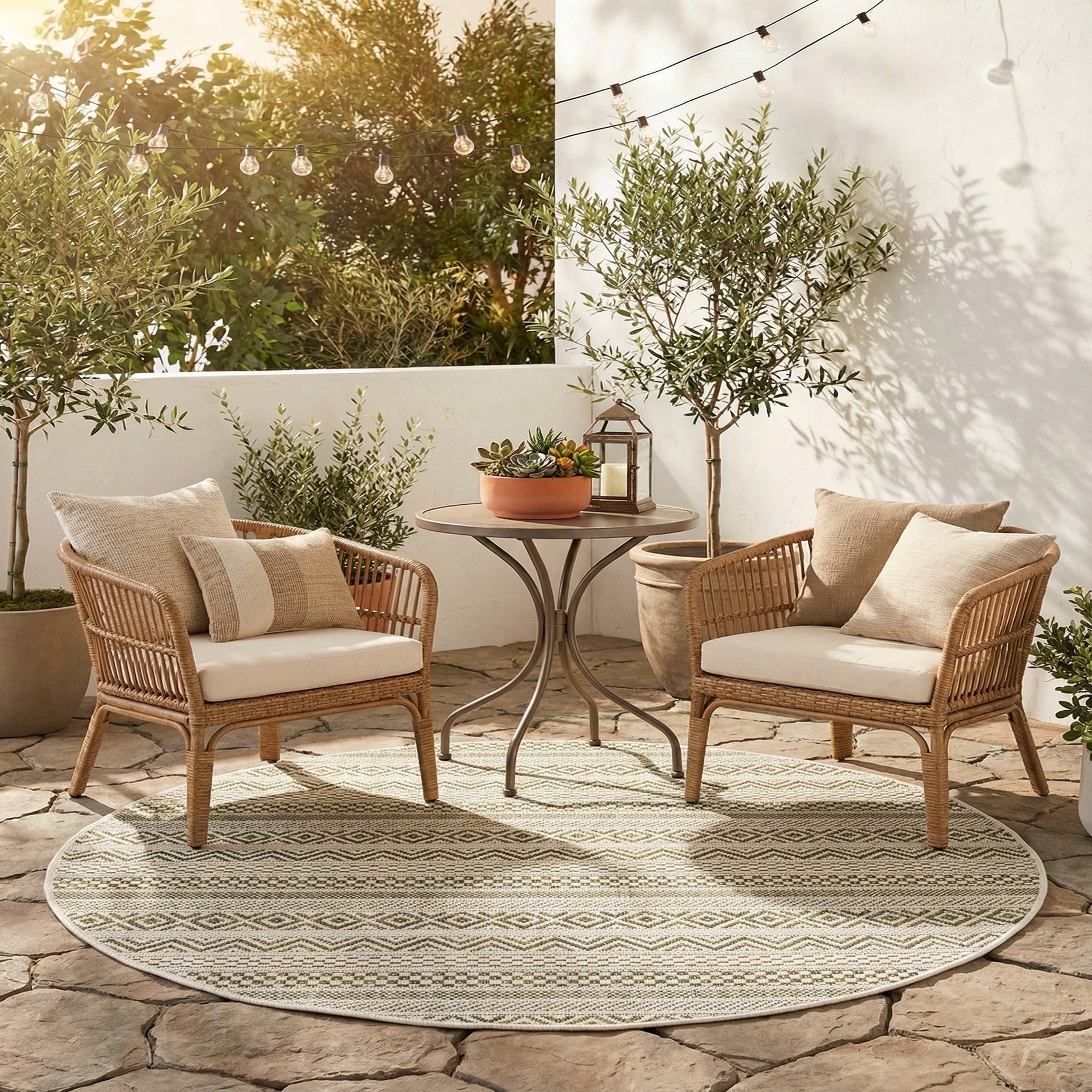 A round green and white tribal flatweave rug with alternating geometric patterns, suitable for indoor or outdoor use.