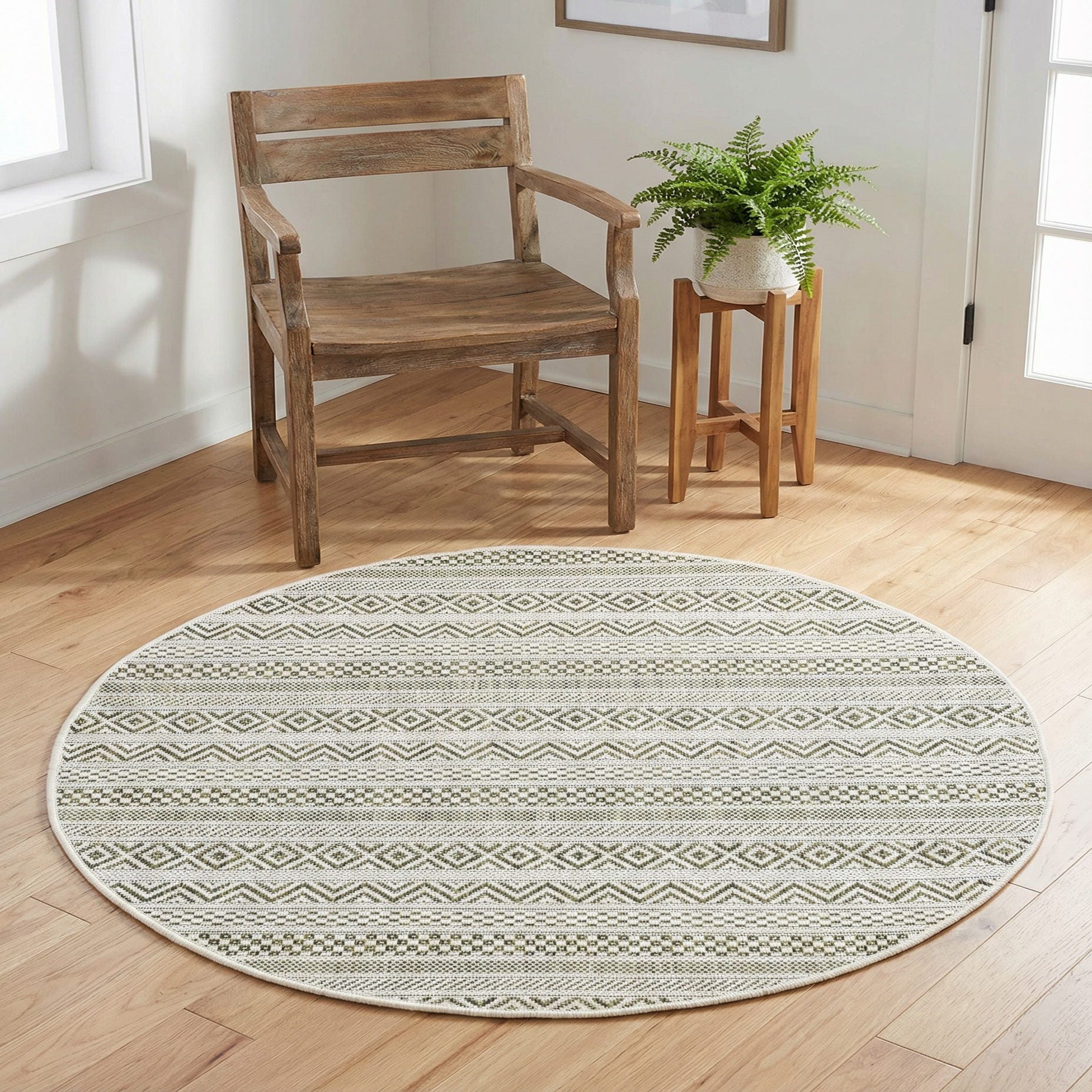 A banded geometric design in ivory crosses a fresh green ground, creating a ribbon-like pattern of diamonds, chevrons and tiny checker rows. The machine-made construction in 100% polypropylene produces a low-profile, tightly woven surface you can feel underfoot — slightly textured rather than plush, with a firm hand that holds the clear, graphic lines of the pattern. The round silhouette and repeating linear motifs give the piece a relaxed, modern-tribal look that reads as casual and composed.