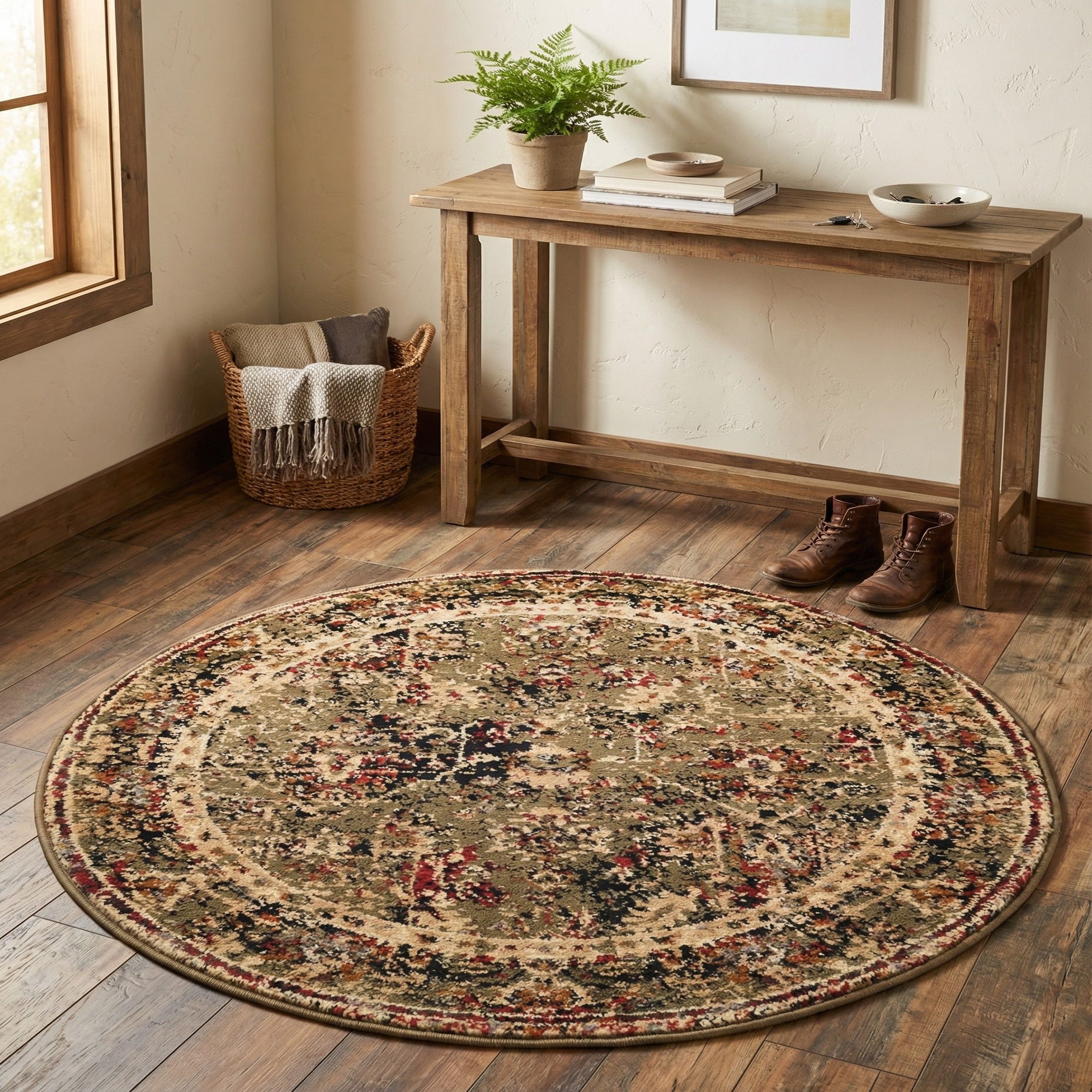 A vintage-inspired, distressed medallion pattern gives this round rug a softly worn, painterly look. A green field provides the background while beige highlights form the faded medallion and border, with black and red accents scattered throughout to add contrast and visual interest. Machine made of 100% polypropylene, the rug has a low-profile, tightly woven pile that feels smooth to the touch with a modest, cushioned give.