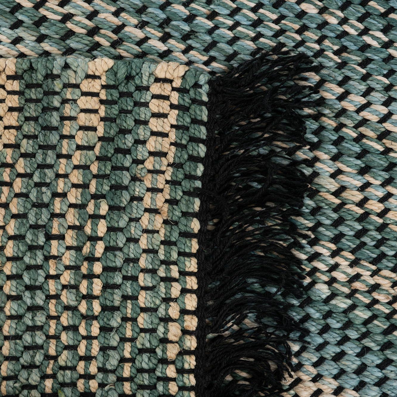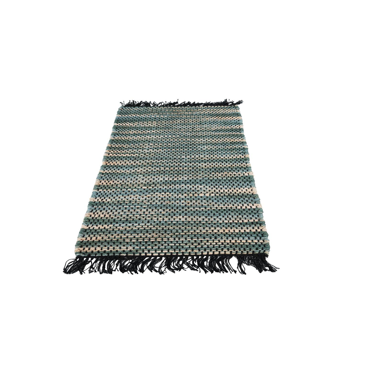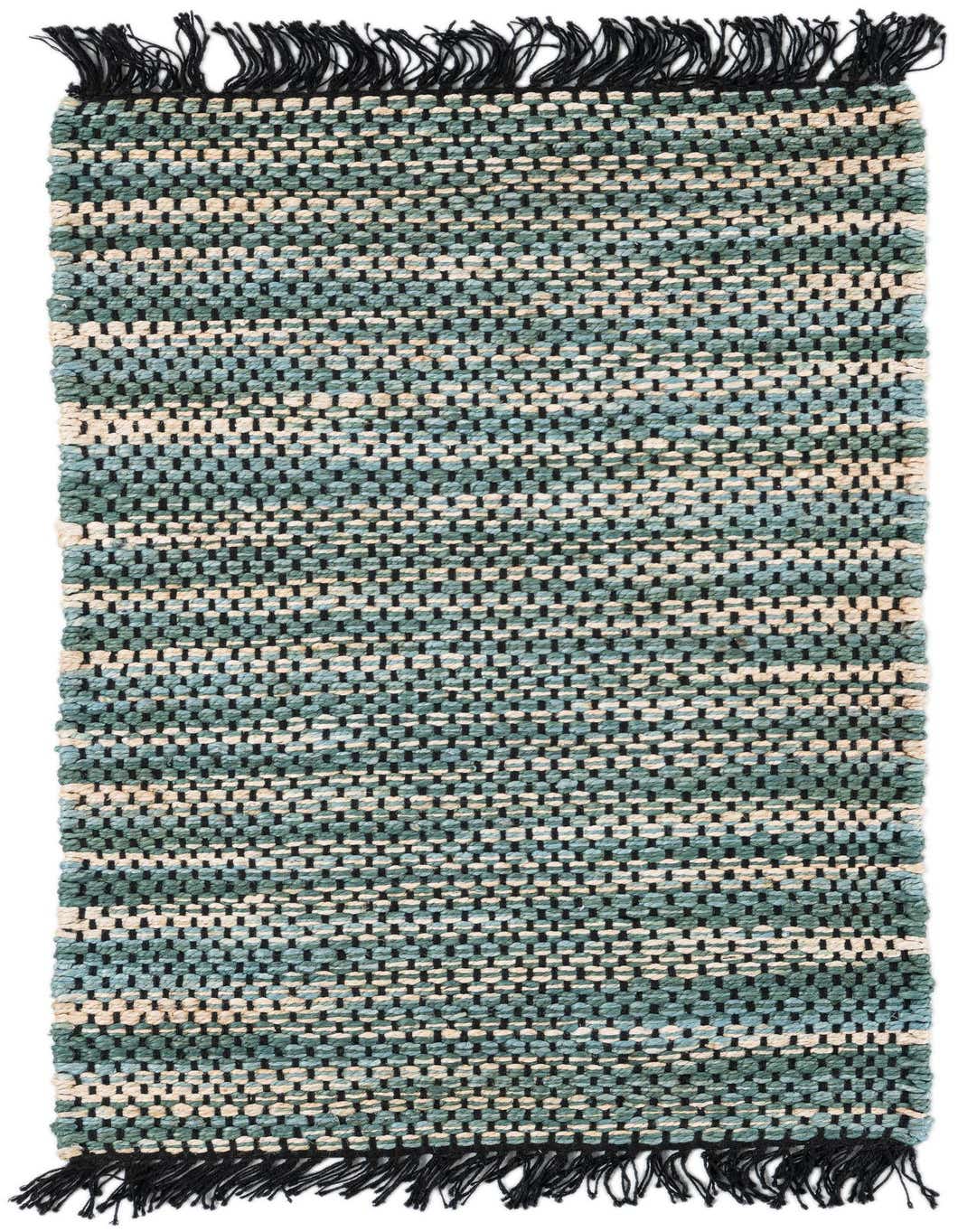 Primary color is Green. Colors in this rug include: Green, Black, Ivory, Light Blue.