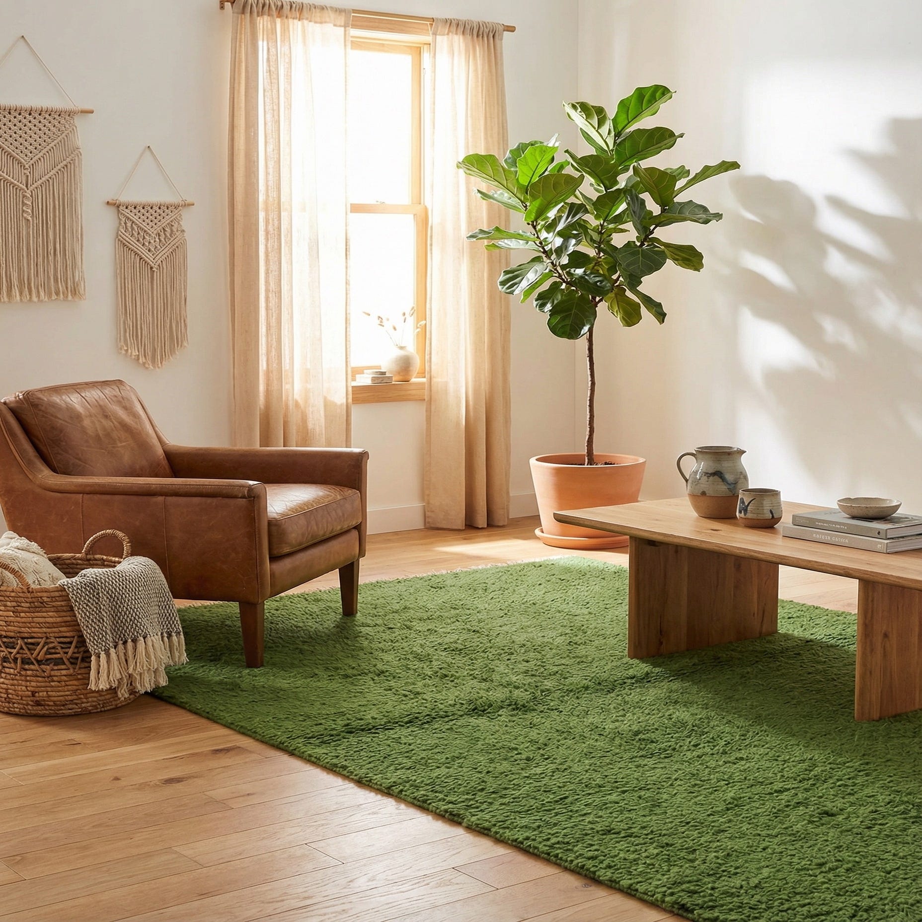 A 3x4 rectangular green shag rug with a thick, plush pile and natural fringe, suitable for indoor spaces.