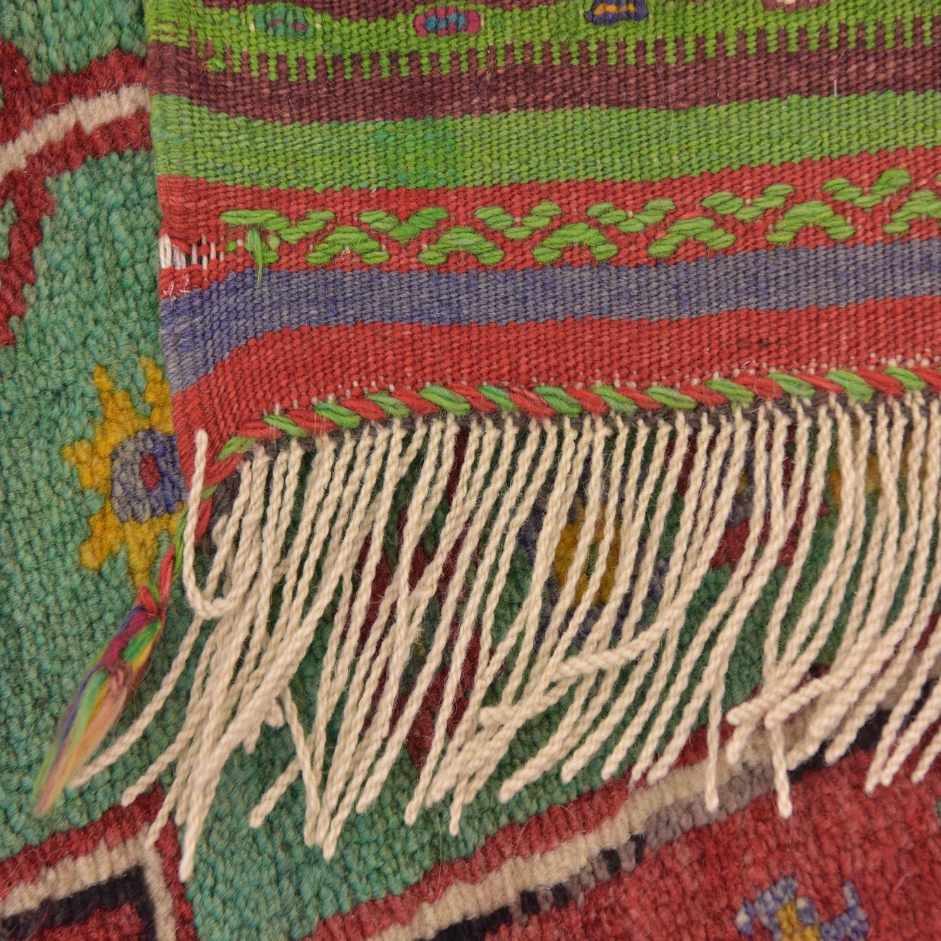 Primary color is Green. Colors in this rug include: Green, Black, Blue, Gold, Ivory, Orange, Red, Pink.