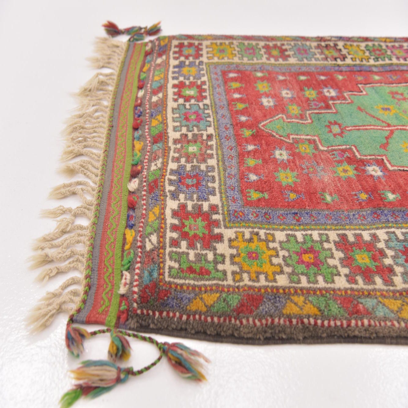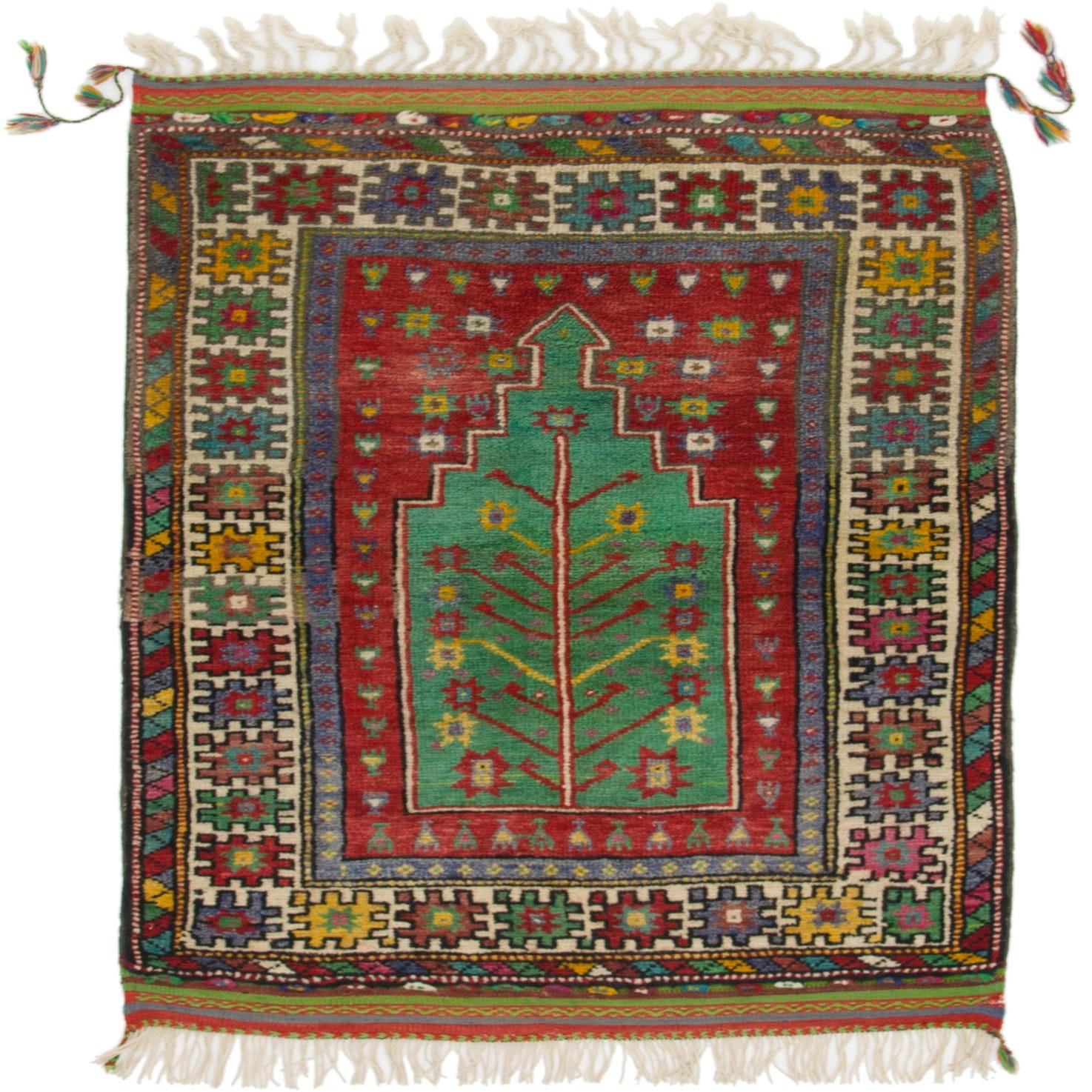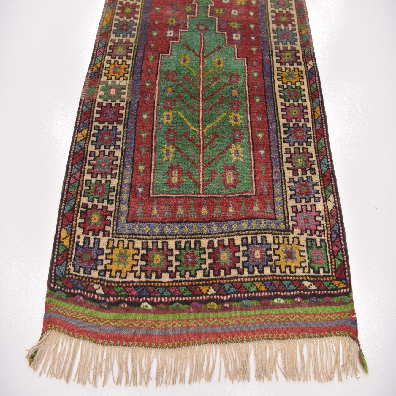 A vibrant 3x5 rectangular Anatolian wool rug featuring a central green tree-of-life motif on a red field, surrounded by tribal patterns in various colors, with white fringes.
