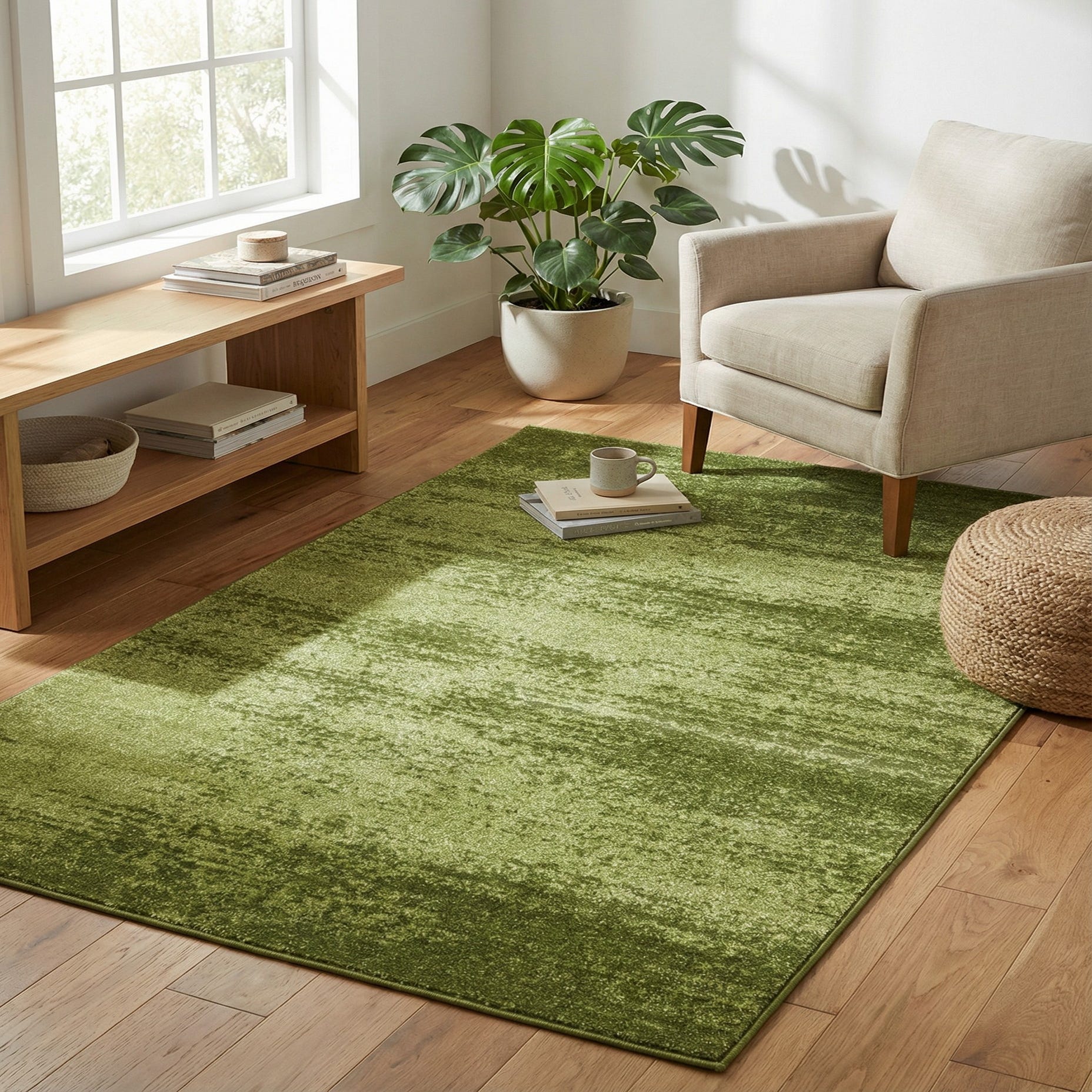 The Angelica rug's low pile and shed-free properties ensure easy maintenance, and the stain-resistant feature adds to its practicality, making it well-suited for high-traffic areas or spaces prone to spills. The rug could lend itself well to modern, minimalist, or Scandinavian-inspired interiors, where its clean lines and minimalistic color scheme would complement natural wood finishes and a light, airy color palette. It could also serve as a harmonious addition to a botanical-themed space, enhancing the lush greenery often found in such decor.