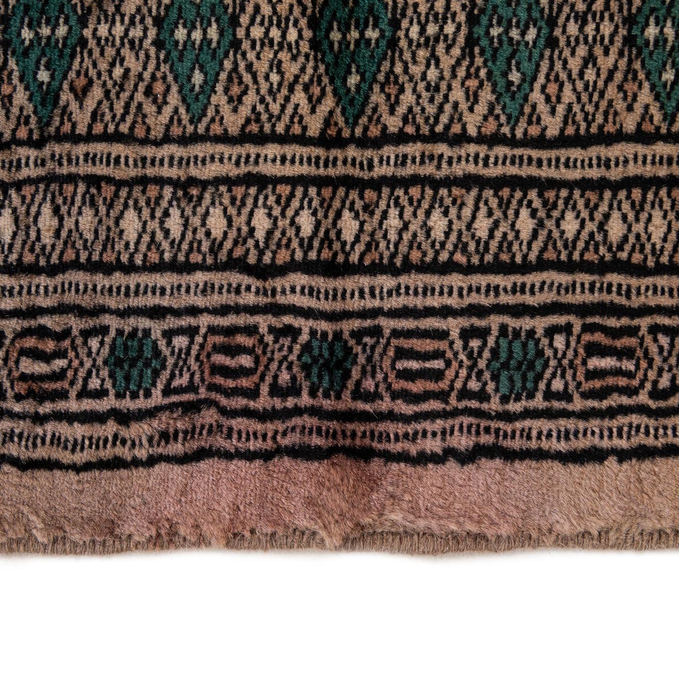 A 3x5 rectangular Bokhara rug featuring a deep green field with traditional tribal patterns and a beige border, handmade from wool.