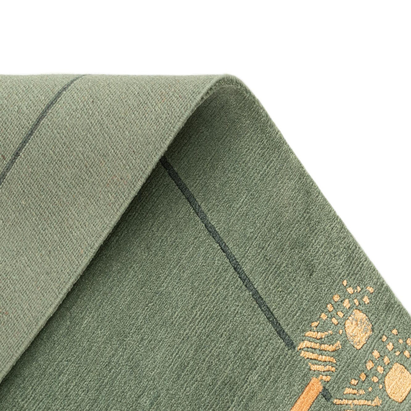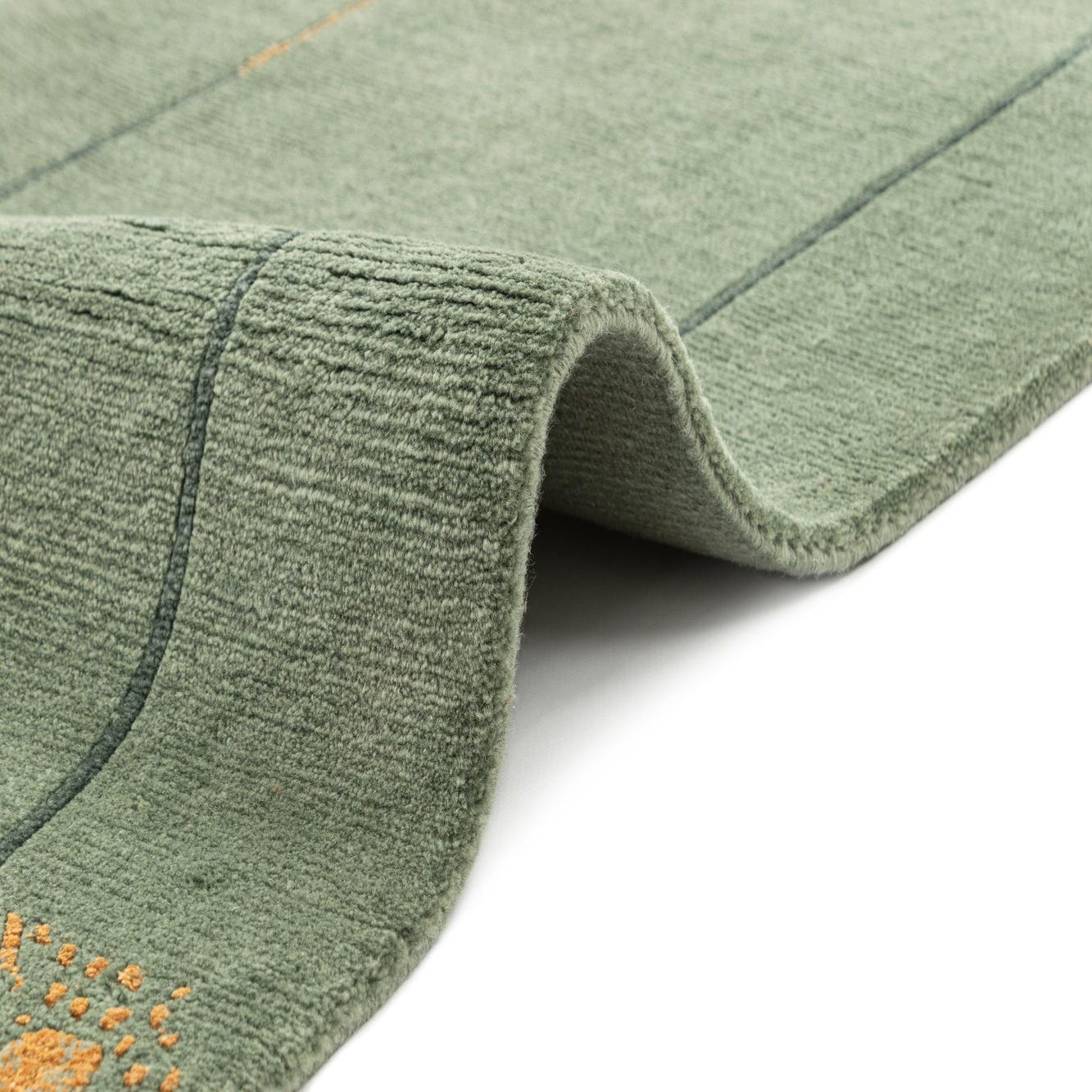 A 3x5 rectangular Gabbeh rug featuring a modern abstract design in shades of green with orange and dark accents.