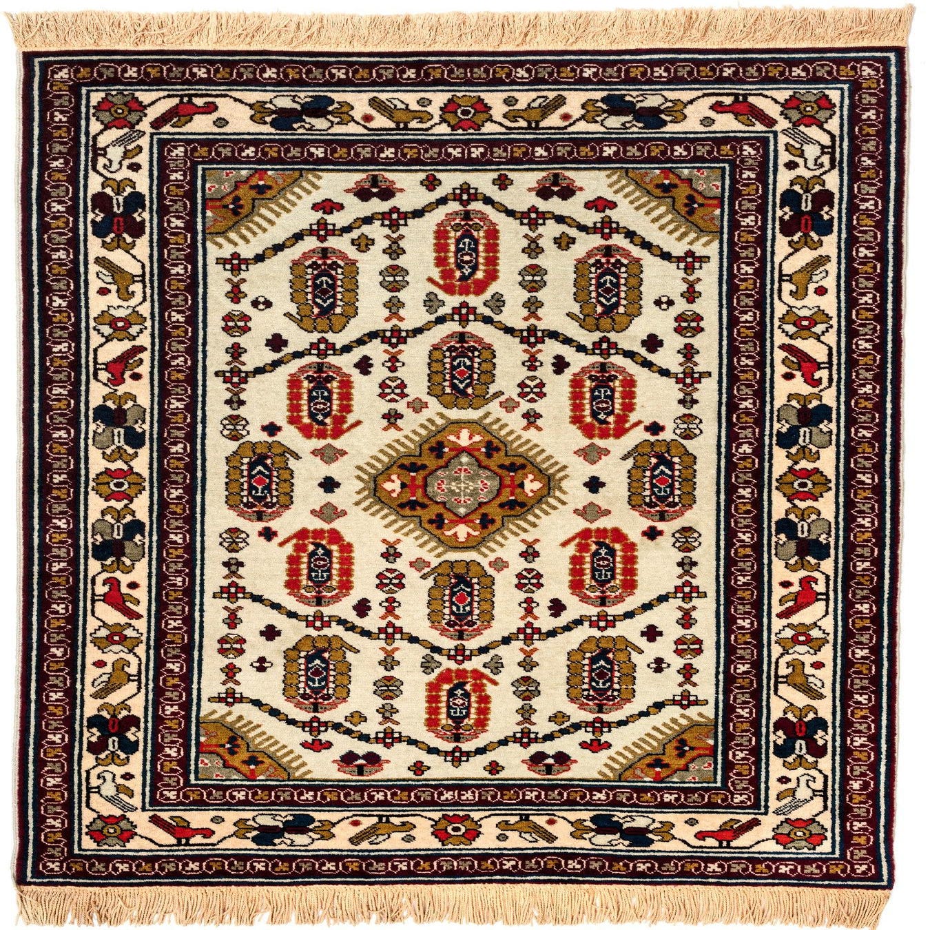 A 3x5 rectangular handmade wool rug with a cream background and intricate traditional patterns in red, blue, green, and gold.