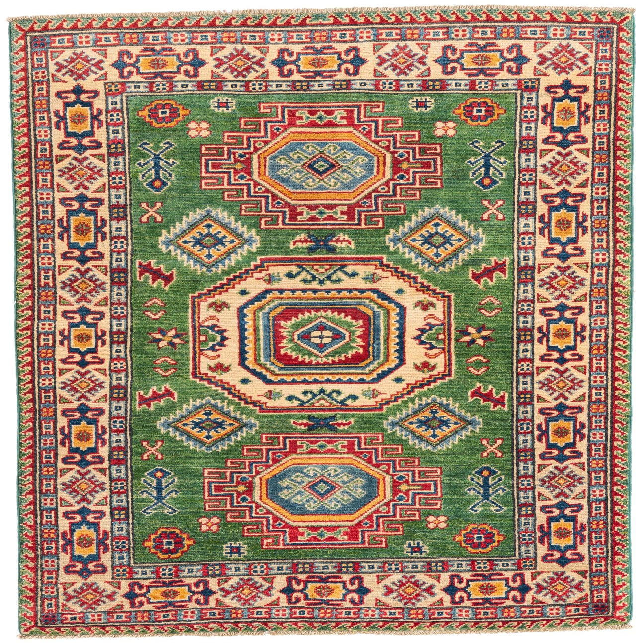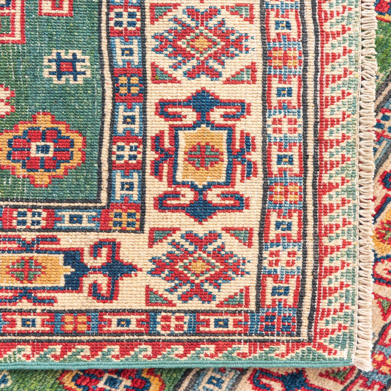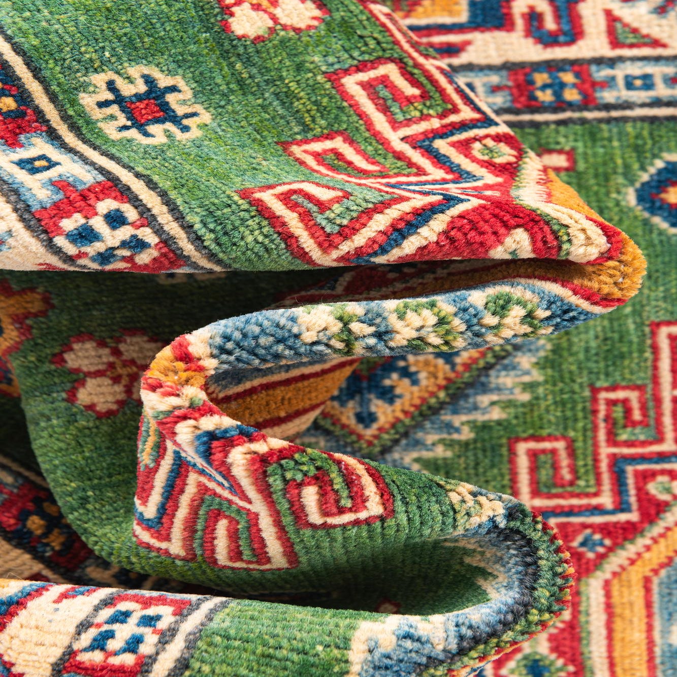 A 3x5 rectangular Kazak rug with a vibrant green field, featuring traditional Southwestern and Oriental medallion patterns in red, blue, yellow, and cream.