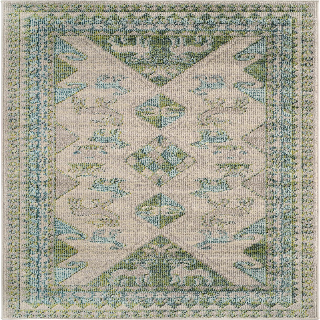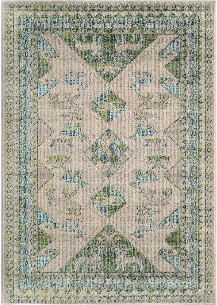 Primary color is Green. Colors in this rug include: Green, Gray, Ivory, Teal.