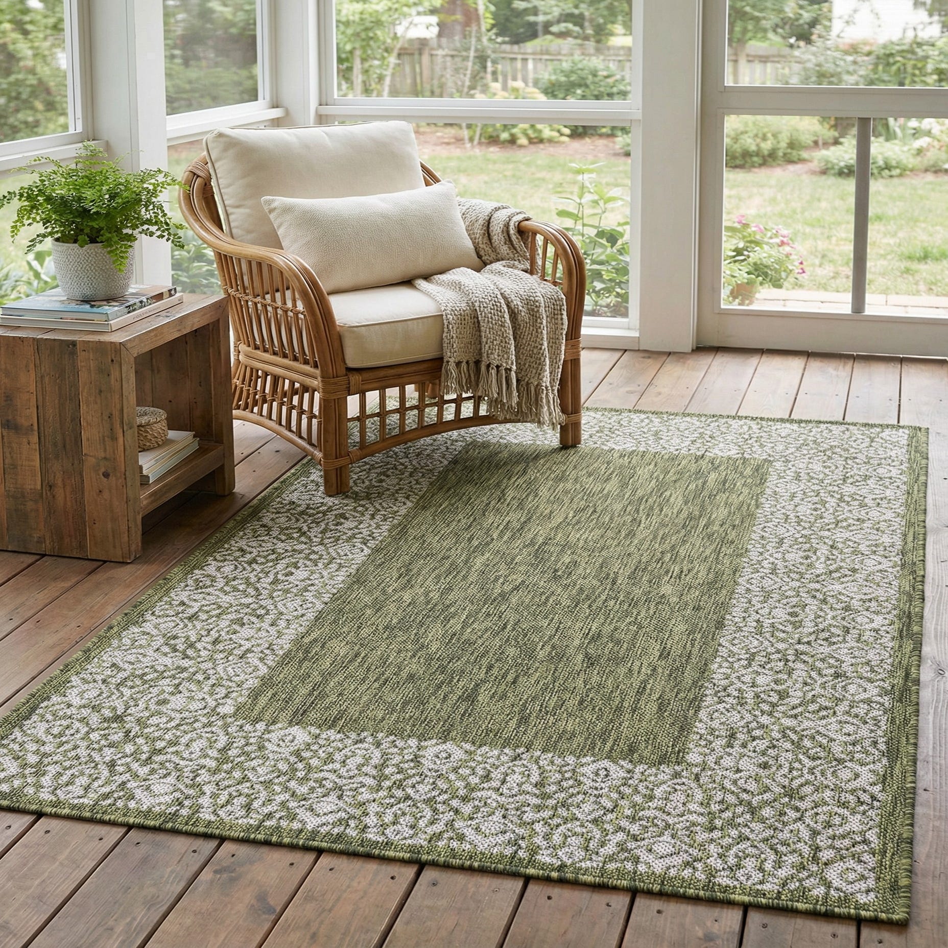 This design fits well on a covered patio or sunroom where the green backdrop complements plantings and woven furniture, or inside an entryway or kitchen to introduce a grounded, graphic element. Pair it with natural wood tones, wicker seating, and ivory or gray textiles for a relaxed, pulled-together look, or use it to bring a touch of pattern to minimalist outdoor living spaces.