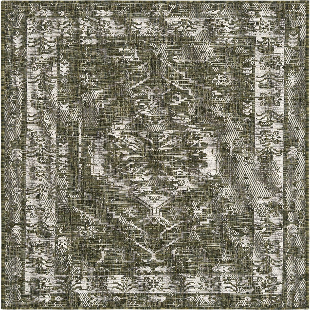 A 3x5 rectangular green and off-white indoor/outdoor rug with a vintage Southwestern pattern, ideal for a patio or entryway.
