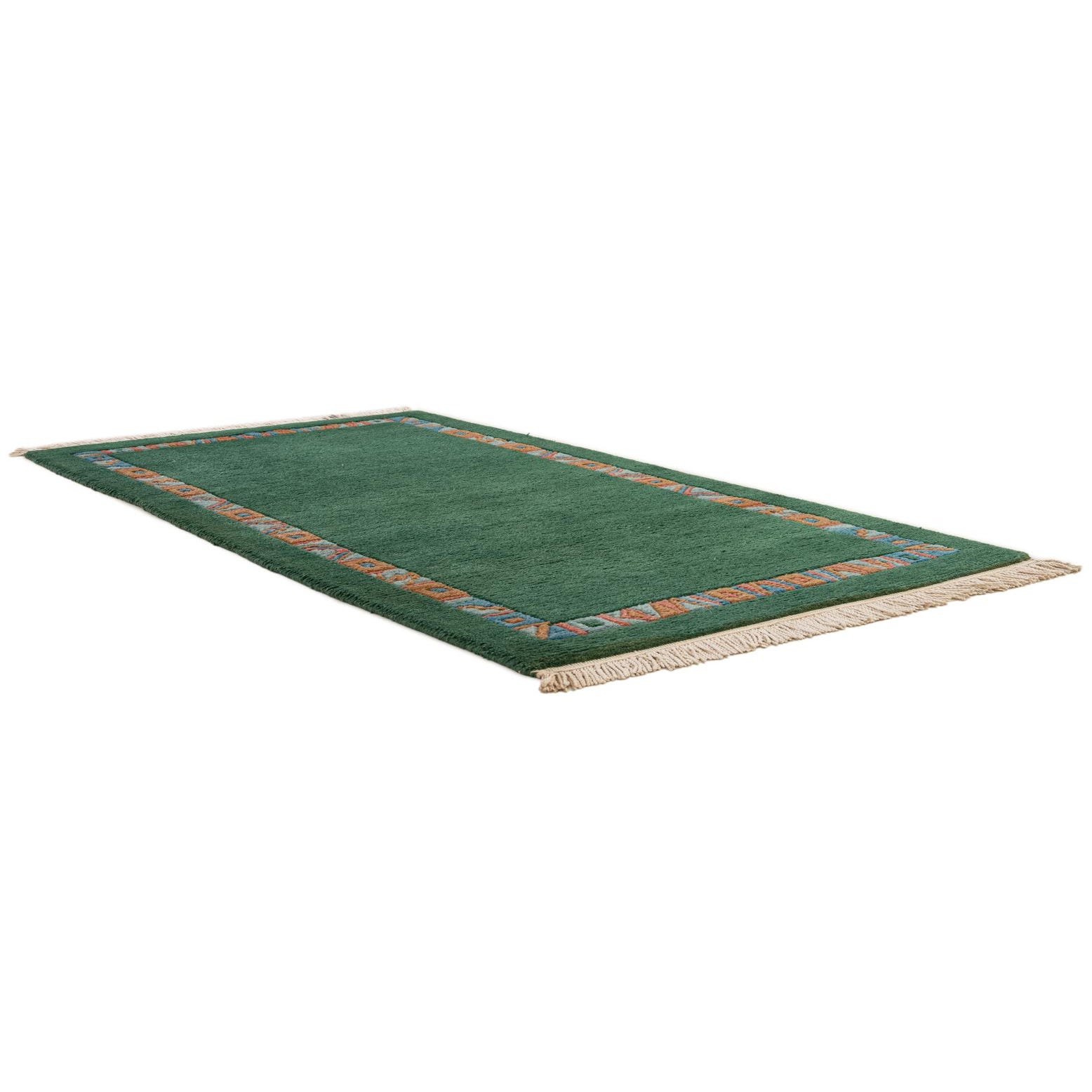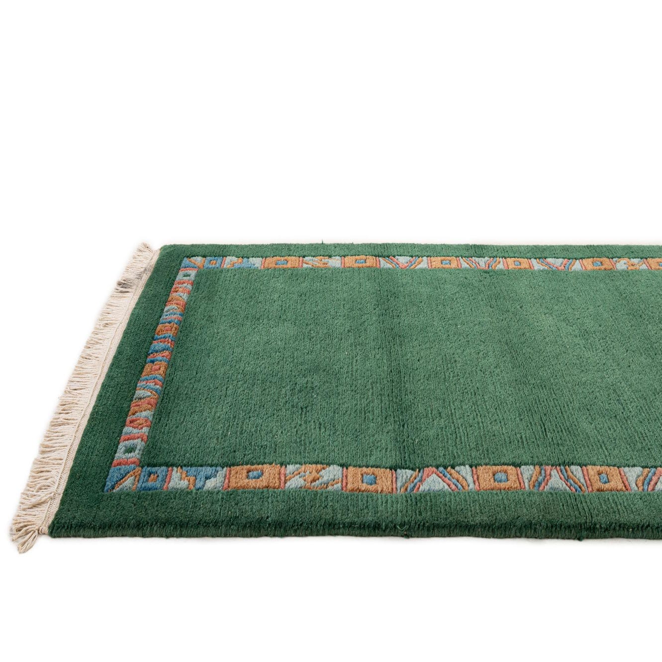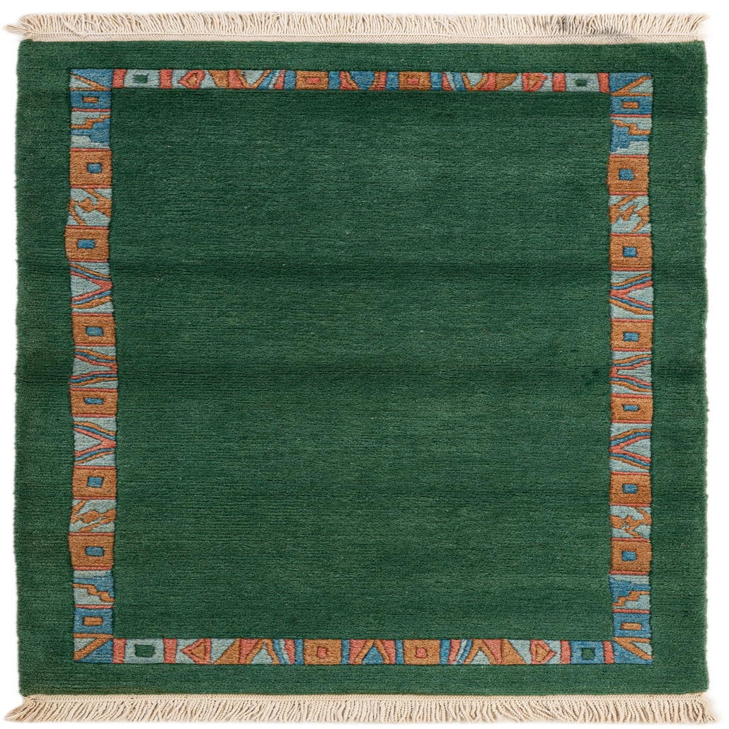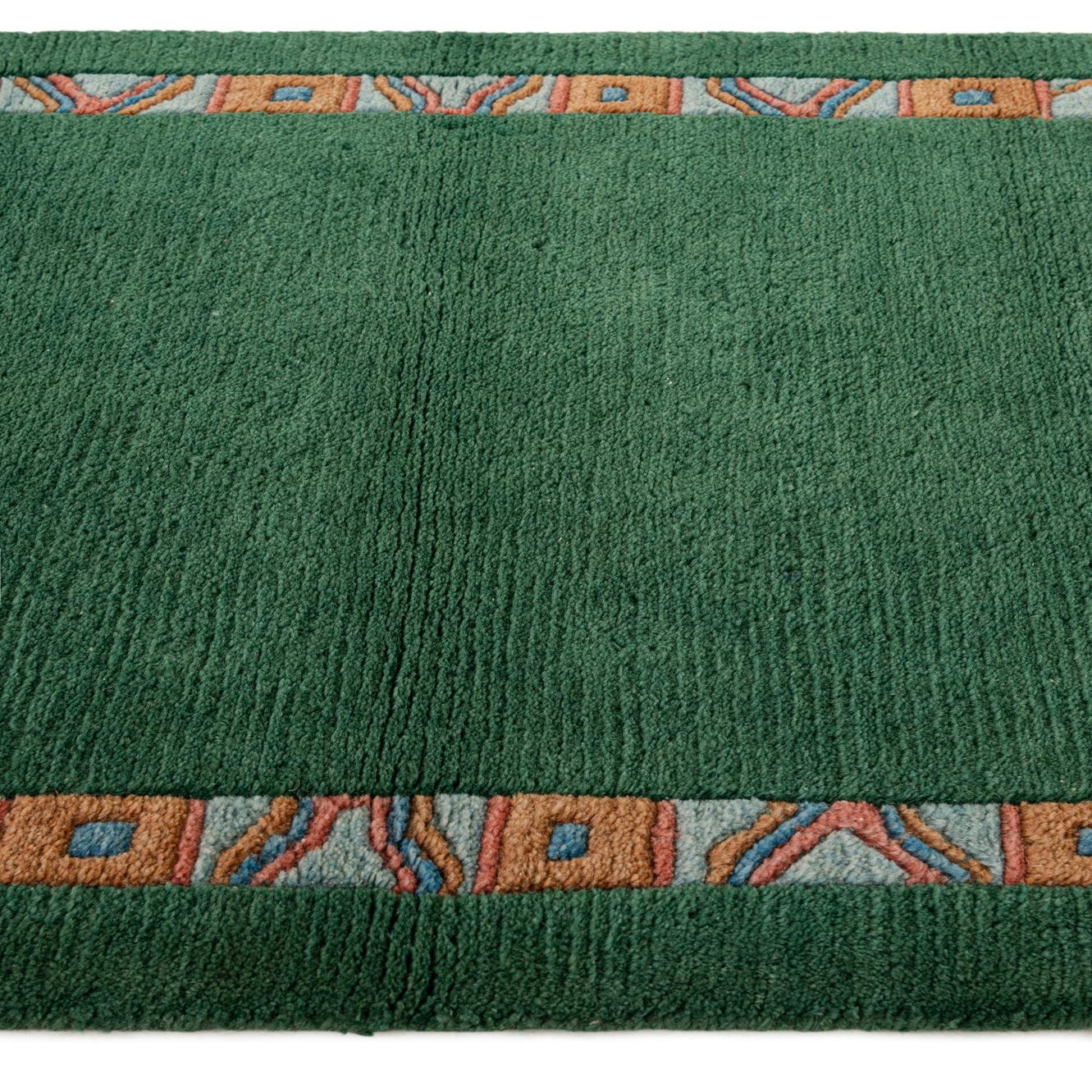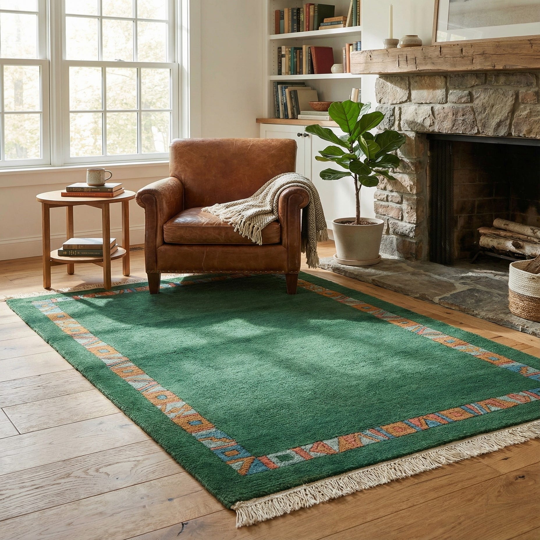 A rectangular 3x5 green wool rug with a colorful abstract border in blue, orange, and red, featuring fringe.