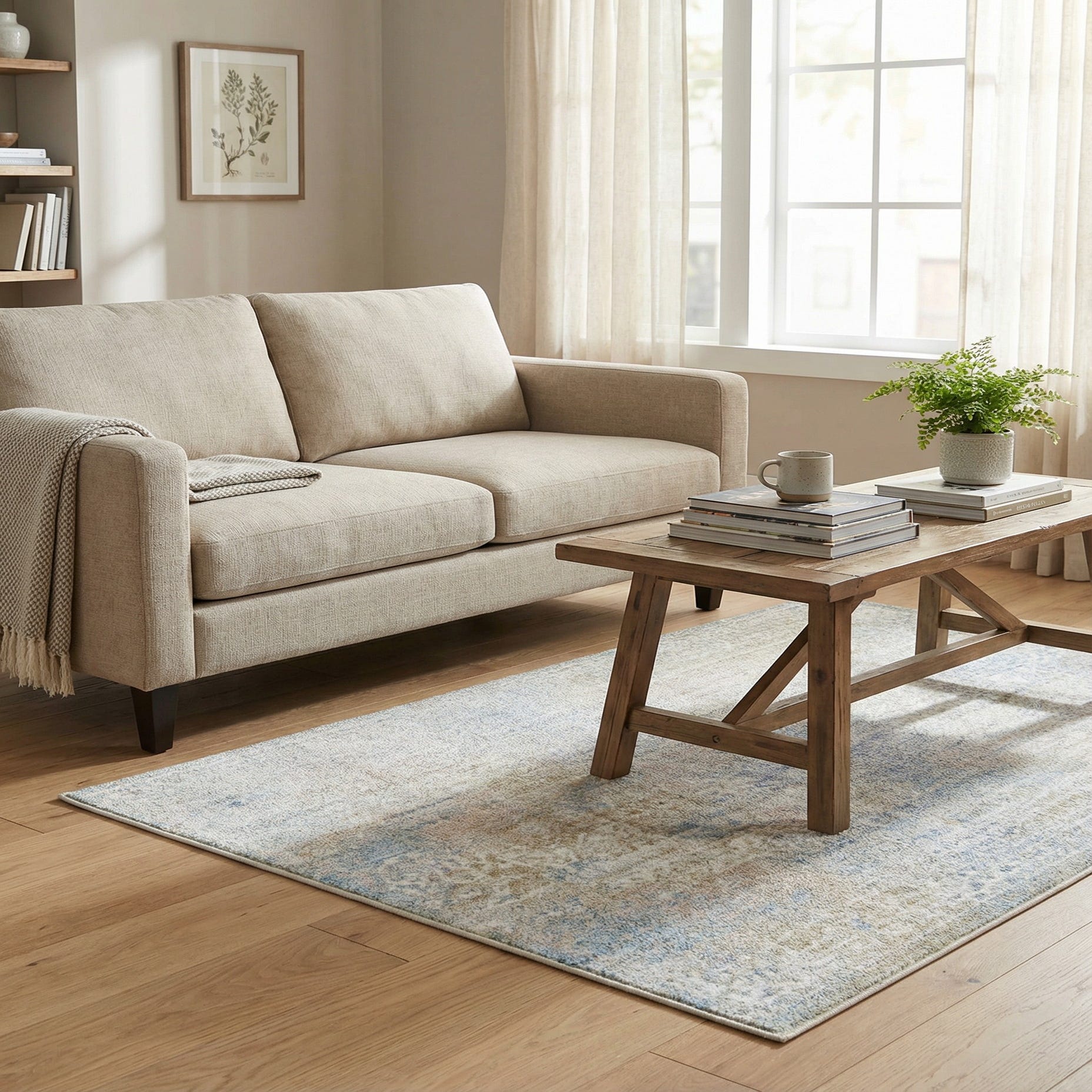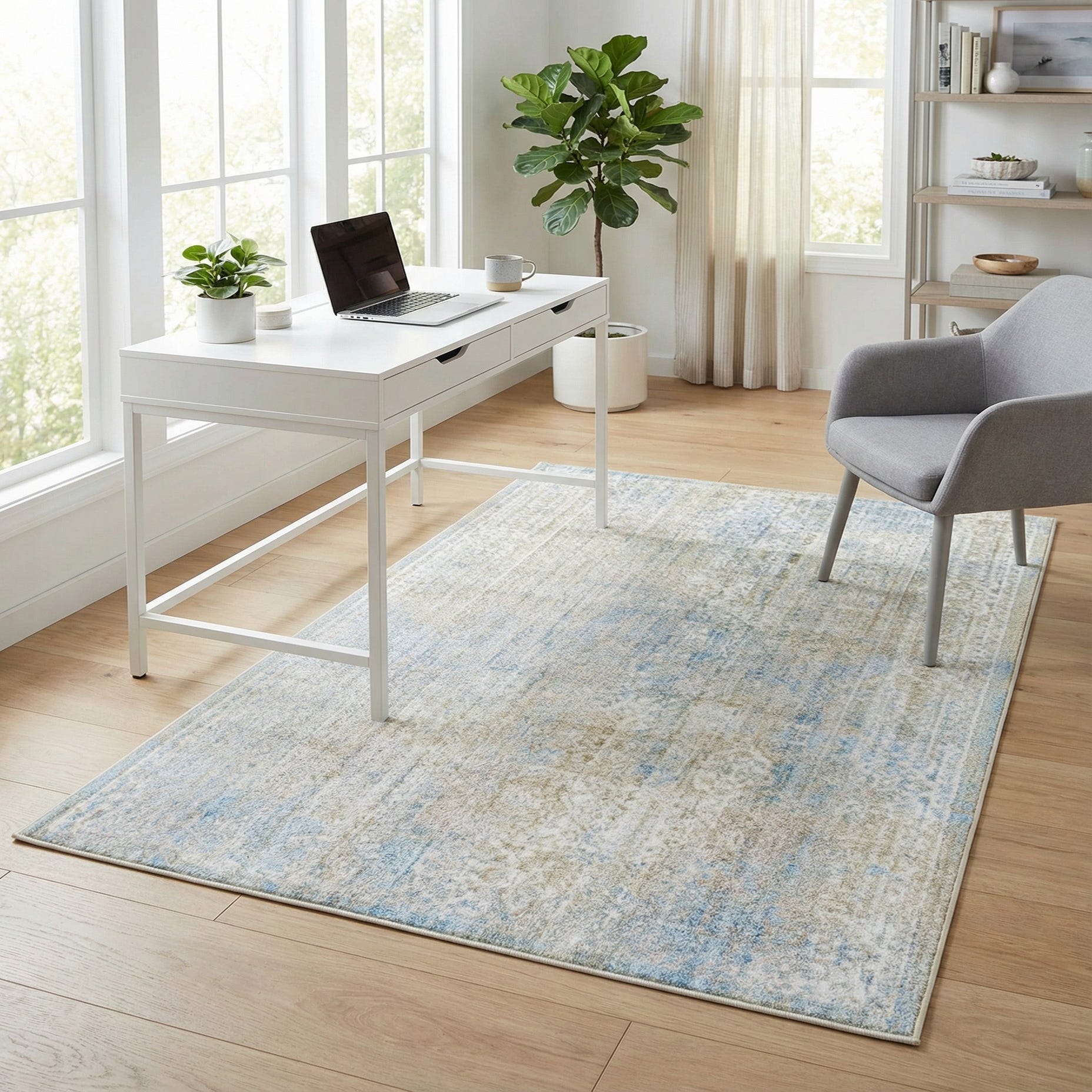 This piece works well in relaxed living rooms, sunlit bedrooms, or a cozy sitting area where layered textures are welcome. Pair it with light wood furniture and linen upholstery for a coastal or cottage vibe, or use it to soften a contemporary space with neutral furnishings and blue accents. It also functions nicely in an entryway or home office to introduce subtle color and pattern without dominating the room.