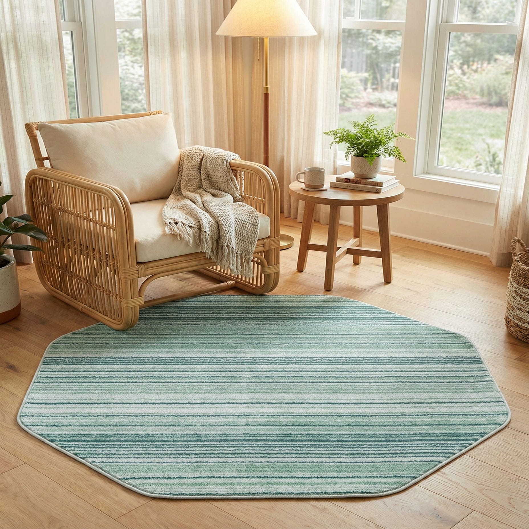 A 4'x4' octagon rug with varying shades of green horizontal stripes, featuring a textured, high pile.