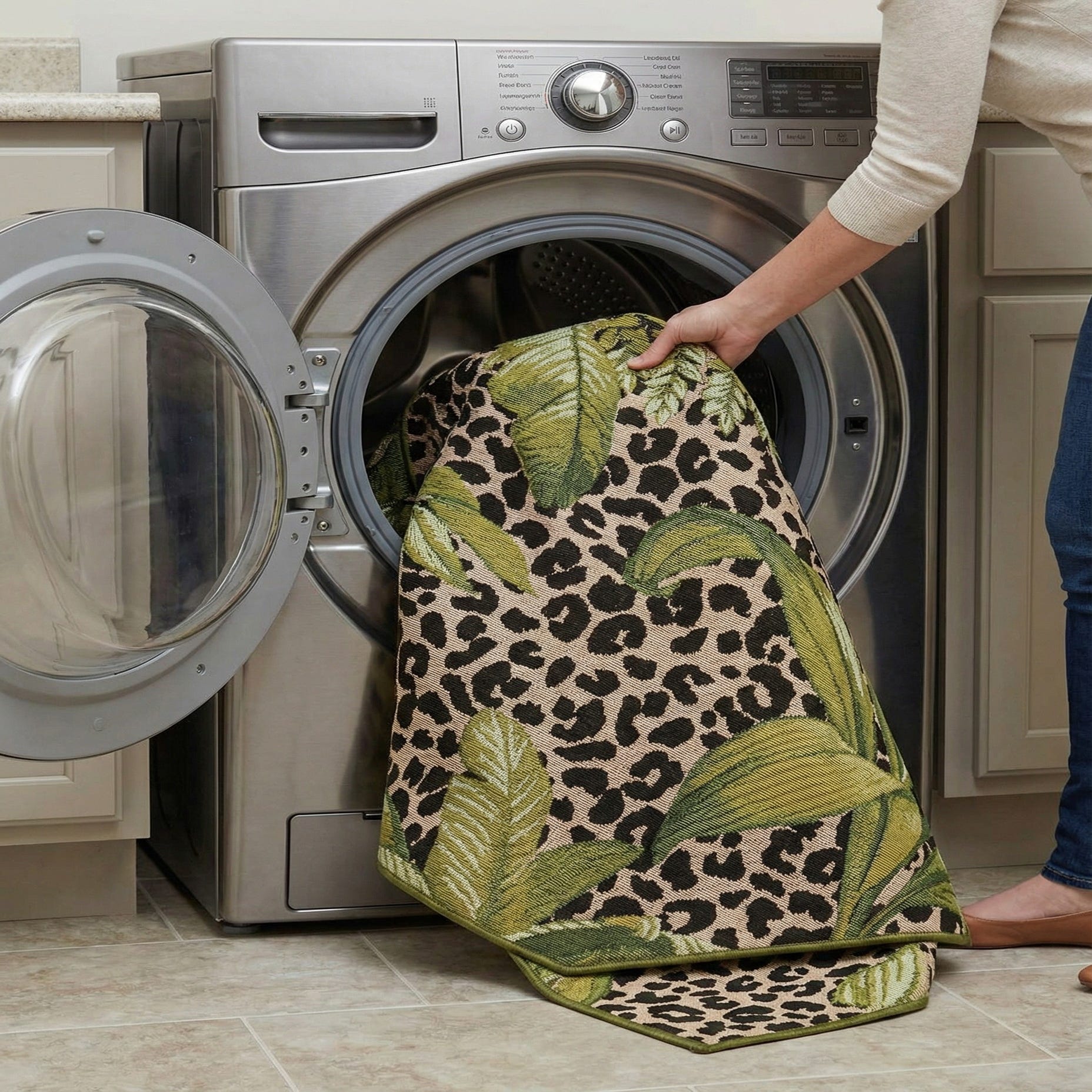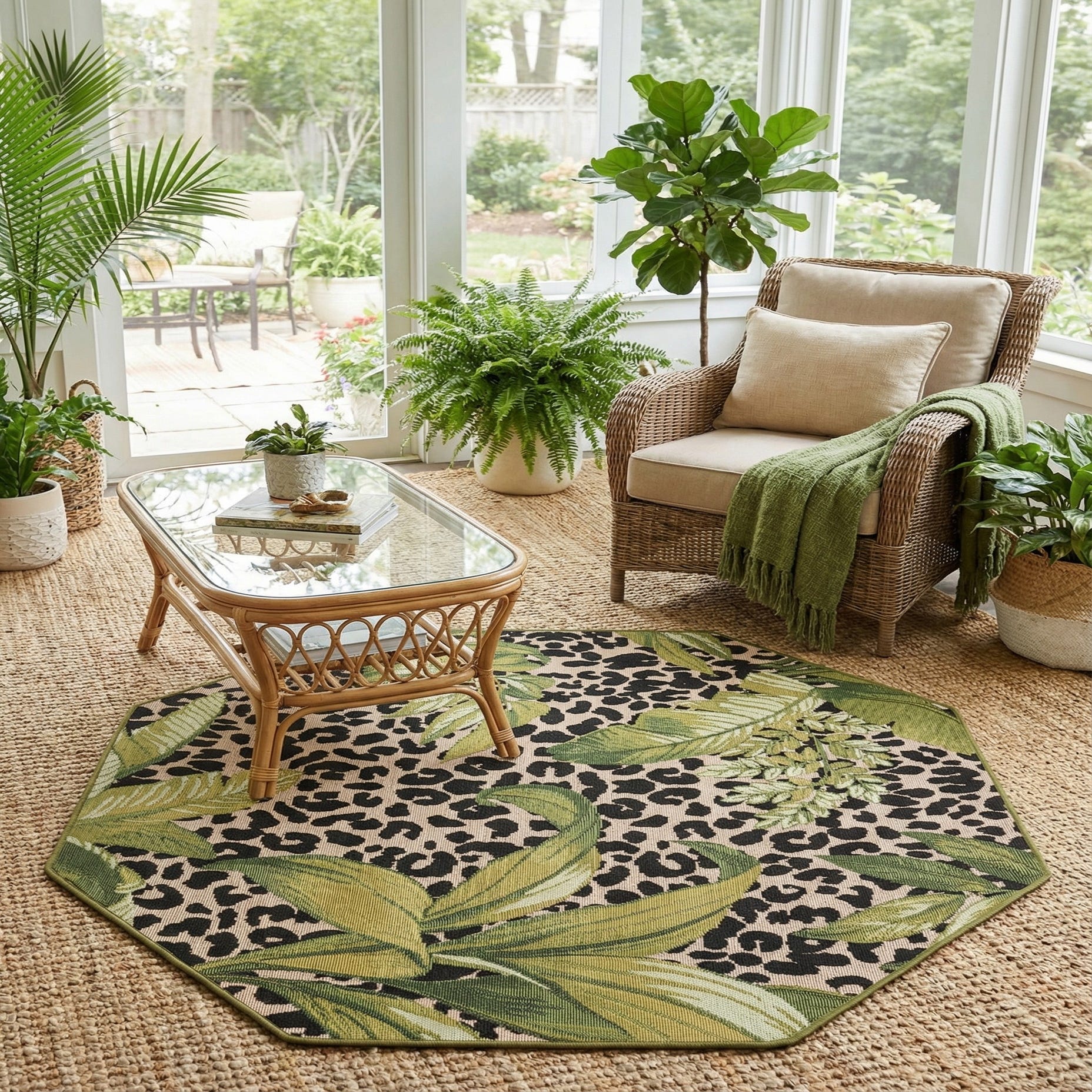 Octagon rug with a green botanical leaf pattern over a beige and black leopard print background, suitable for indoor/outdoor use.
