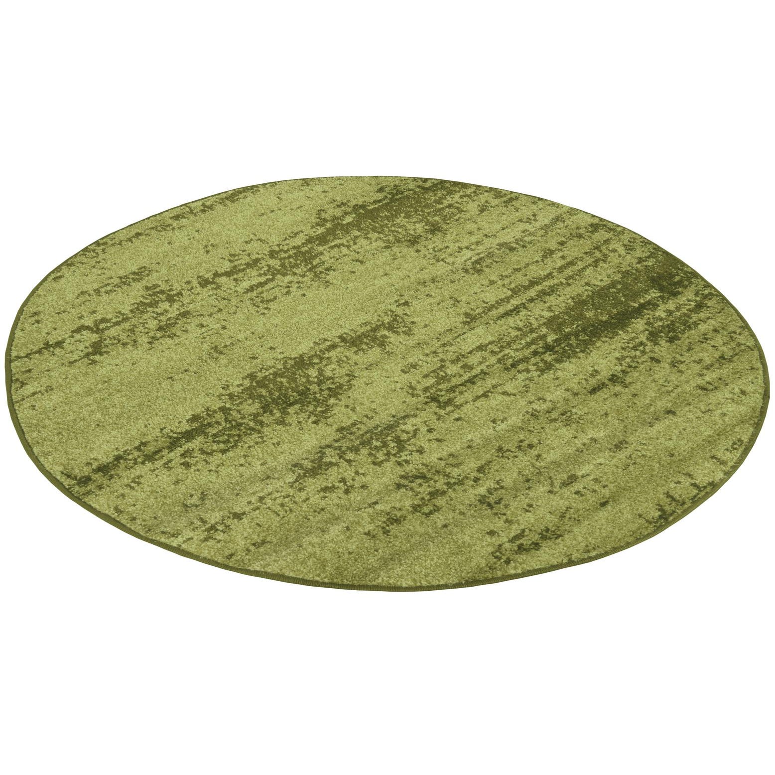 A round area rug with a saturated green background punctuated by hunter green striations that create a soft, painterly effect. The pattern is tonal and gently distressed, formed by subtle variations in pile and finish rather than a defined motif, giving the surface depth and movement. The overall style reads modern-transitional—clean and simple, with enough texture to add visual interest without competing with other patterns.
