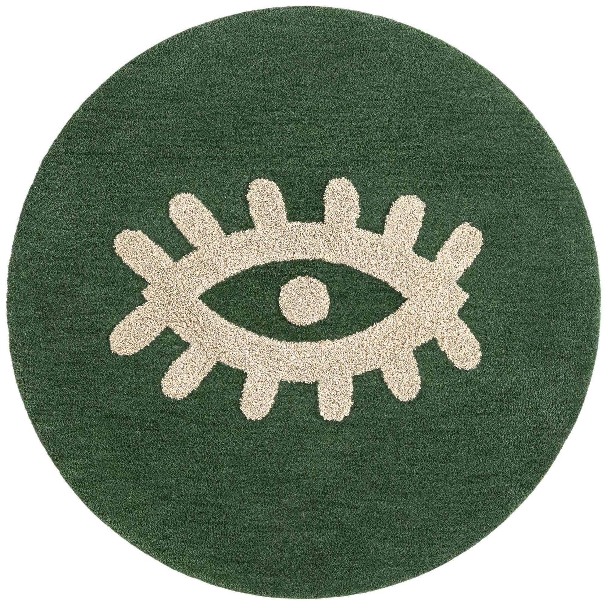 A hand-tufted piece crafted from 100% wool, this round rug pairs a deep green field with a bold, cream eye motif at the center. The graphic pattern is tactile—the cream design is worked with a higher, nubby tuft that rises slightly above the denser, low-profile green background, creating a subtle sculptural effect. The wool pile feels springy and soft underfoot, with natural fiber texture that gives the surface gentle depth and warmth.
