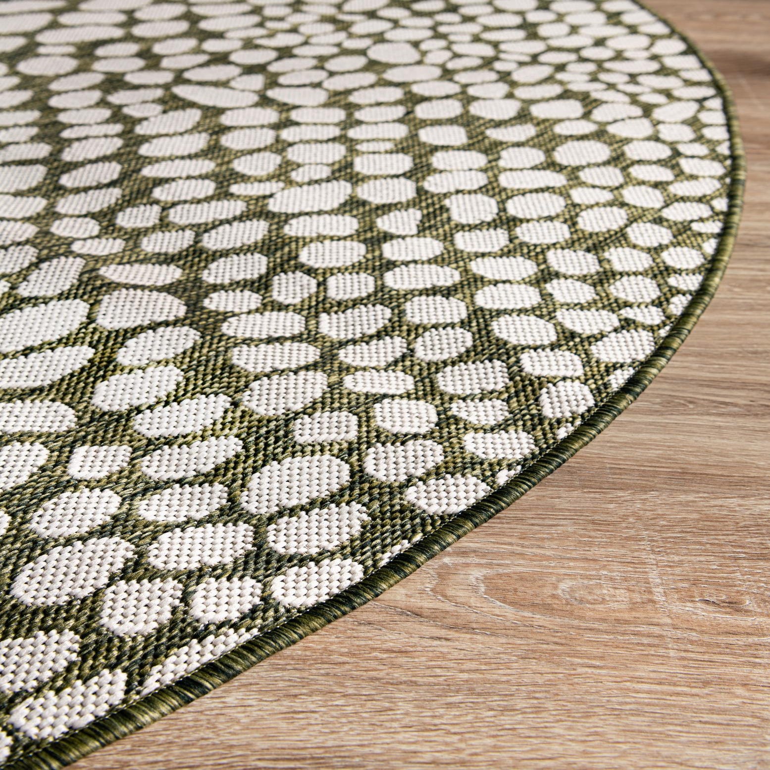 A round outdoor rug with a green ground and an irregular ivory pebble motif, this design creates gentle movement as the pebble shapes shift in scale from center to edge. The pattern has an organic, slightly contemporary feel that pairs well with both clean-lined and layered looks. Machine-made from 100% polypropylene, the tightly woven face offers a low-profile texture with a subtle contrast where the ivory motif meets the green background.