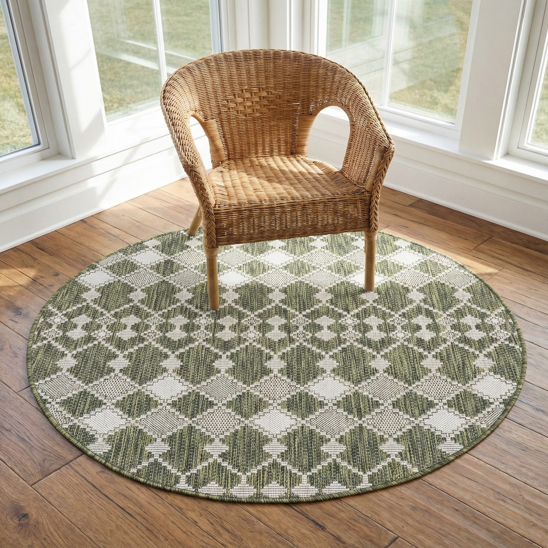 A 4' round green and white trellis pattern rug, made of polypropylene, suitable for indoor or outdoor use.