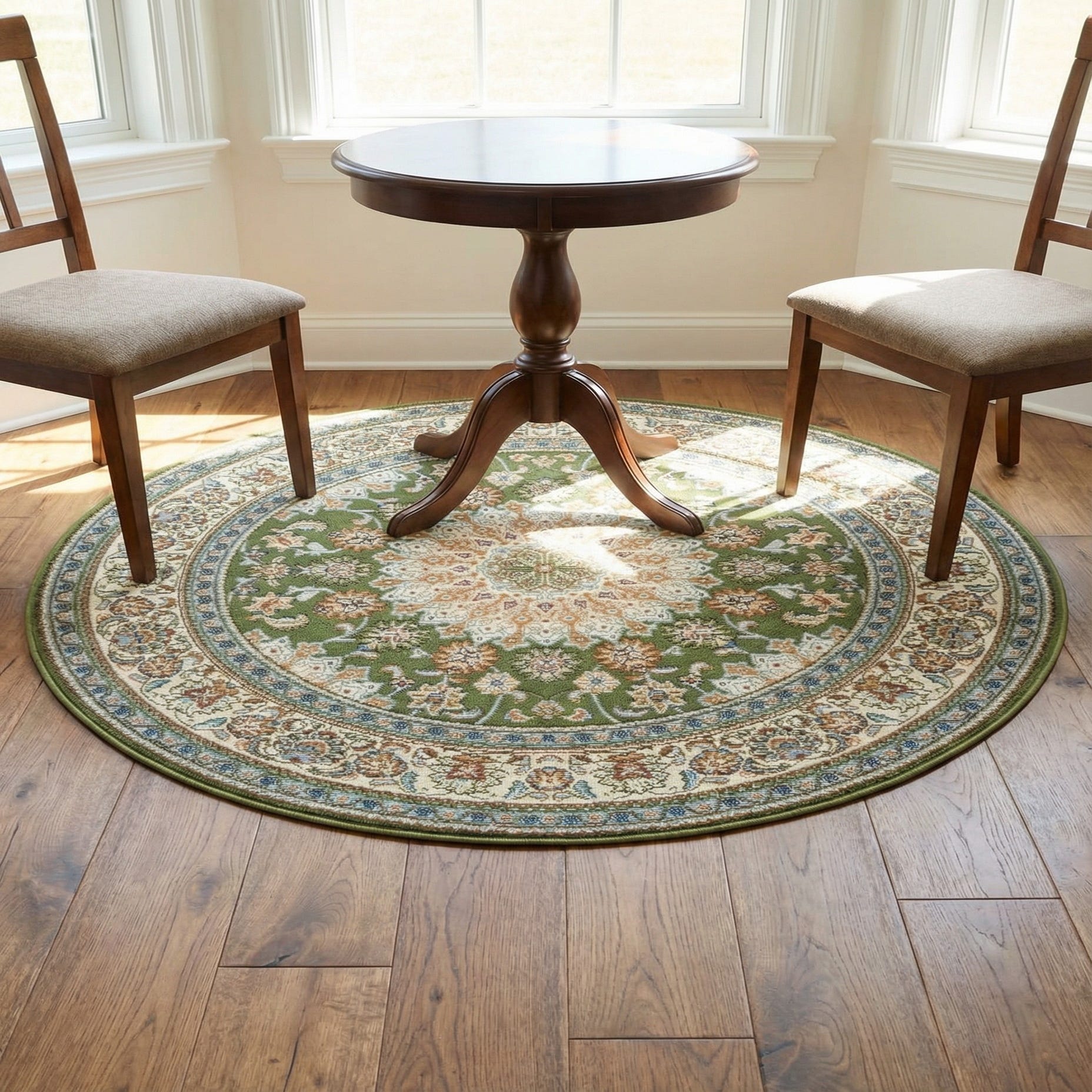 Perfect for a covered patio, screened porch or sunroom, the round shape defines small seating areas—place it beneath a bistro set, a pair of lounge chairs, or a petite dining table. The green and blue palette pairs nicely with warm wood tones, navy or ivory cushions, and woven outdoor furniture; it also brings pattern and color to a neutral entry or garden-facing breakfast nook.