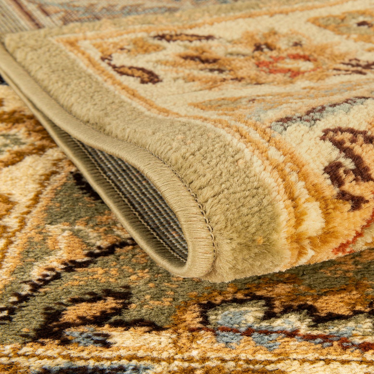 Use this rug to anchor a seating area or place it beneath a small dining set or entry table where its traditional pattern can set a warm tone. It pairs well with warm wood furniture, neutral upholstery, and accents in light blue or rust red to pick up the rug’s secondary hues. The design works in classic, cottage, and transitional interiors, and also complements modern rooms that need a vintage-inspired anchor without overwhelming the space.