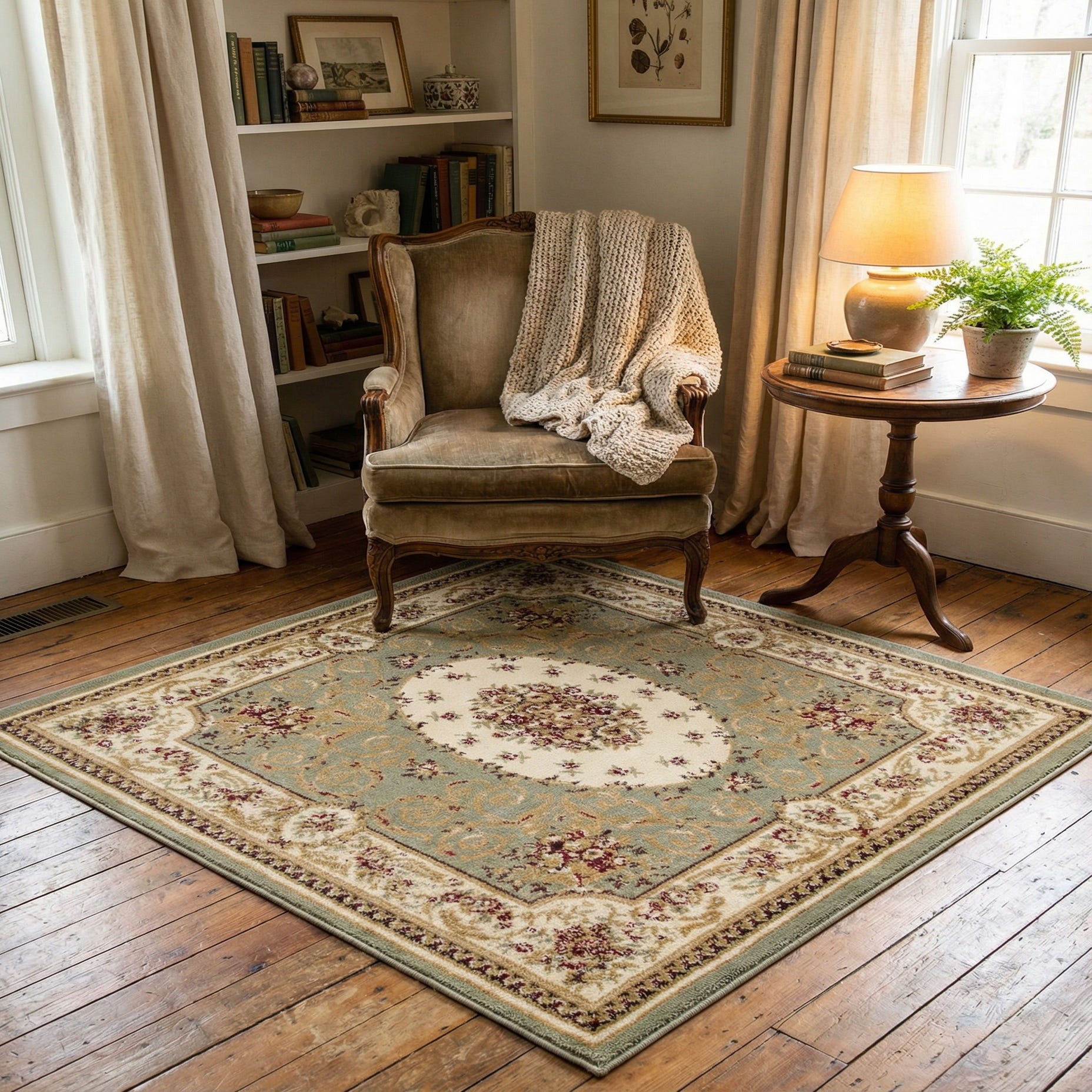 The polypropylene construction gives the rug a dense, low-profile pile that feels soft underfoot and holds the pattern’s fine details. It’s well suited to an entry hall or a more formal living or dining area, and also works as a grounding square under a small table or seating arrangement. Pair it with warm wood furniture, cream or tan upholstery, and antique brass or dark finish accents for a cohesive, classic interior.