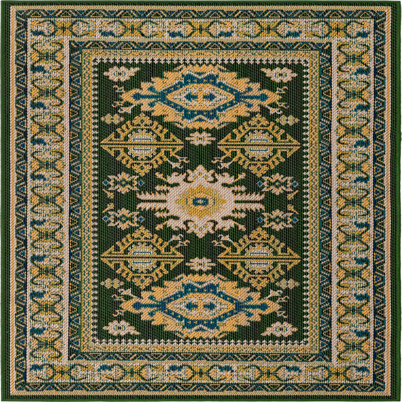 A classic medallion and border layout in a lively color palette gives this machine-made 100% polypropylene outdoor rug a refined, traditional look with a modern outdoor sensibility. The green field provides a rich backdrop for layered geometric and floral motifs in blue, ivory, yellow and subtle pink accents. The construction is low-profile and tightly woven, creating a slightly ribbed surface that feels firm and textured underfoot while maintaining a neat, flat appearance.